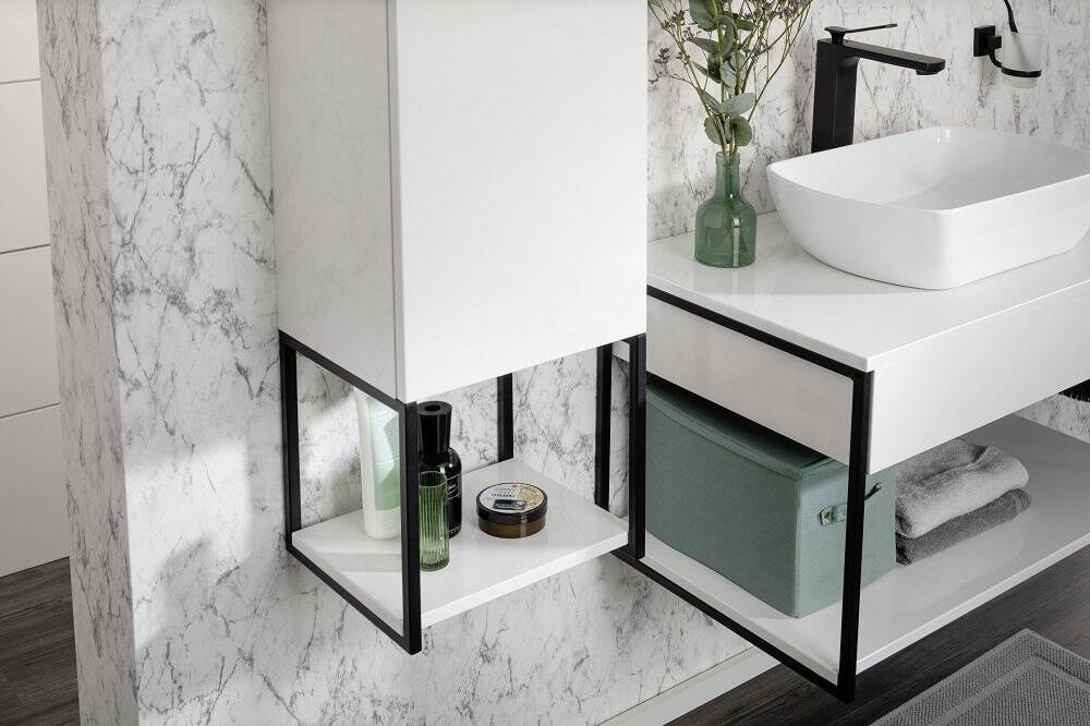 - Szafka łazienkowa 107,5 cm w kolorze białym z metalową czarna rama i uchwytem na ręcznik z boku. Produkowana w Niemczech z najwyższej jakości materiałów gwarantuje idealne dopasowanie do każdej łazienki.