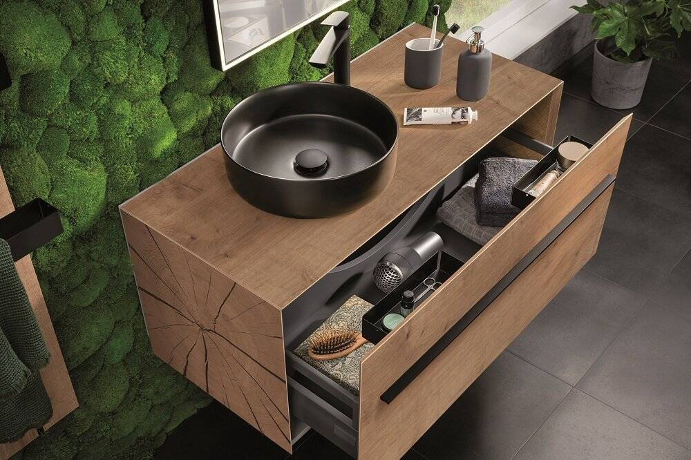 Lanzet Woodblock to efektowny zestaw mebli łazienkowych z widocznymi słojami, okrągłą umywalką nablatową i panelami ściennymi.