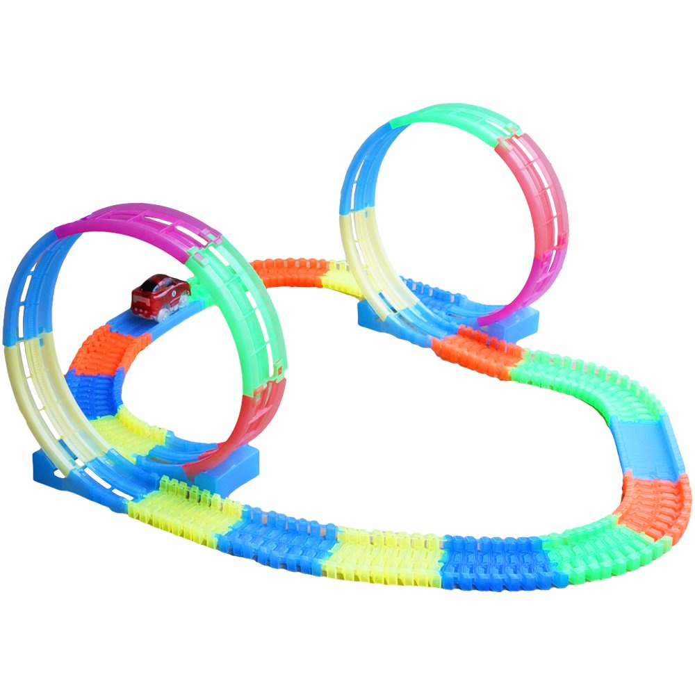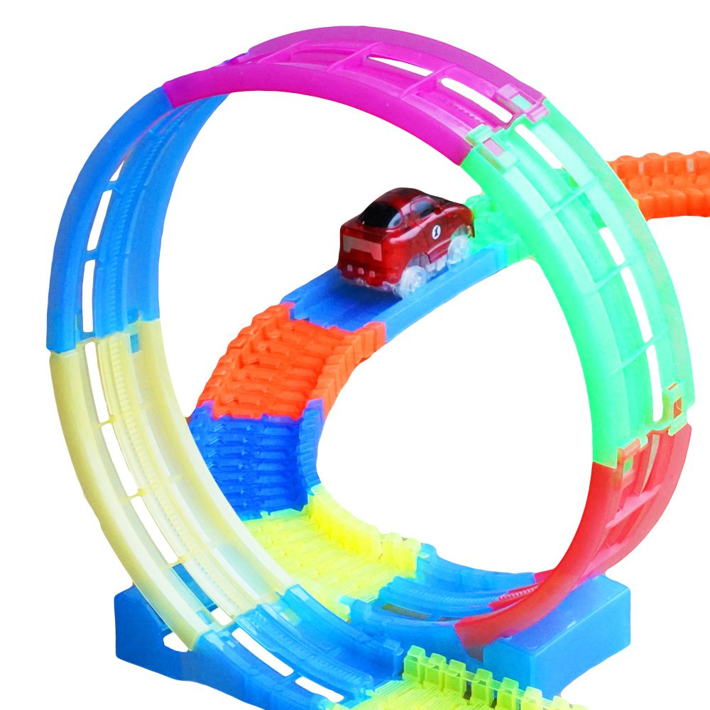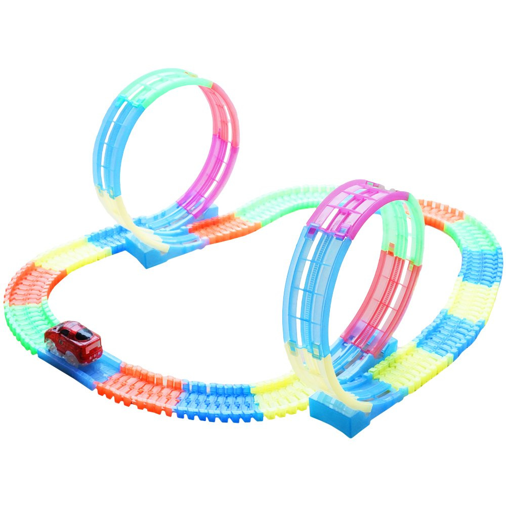 - Zestaw elastycznych torów i świecącego autka, które jeździ w różnych pozycjach!