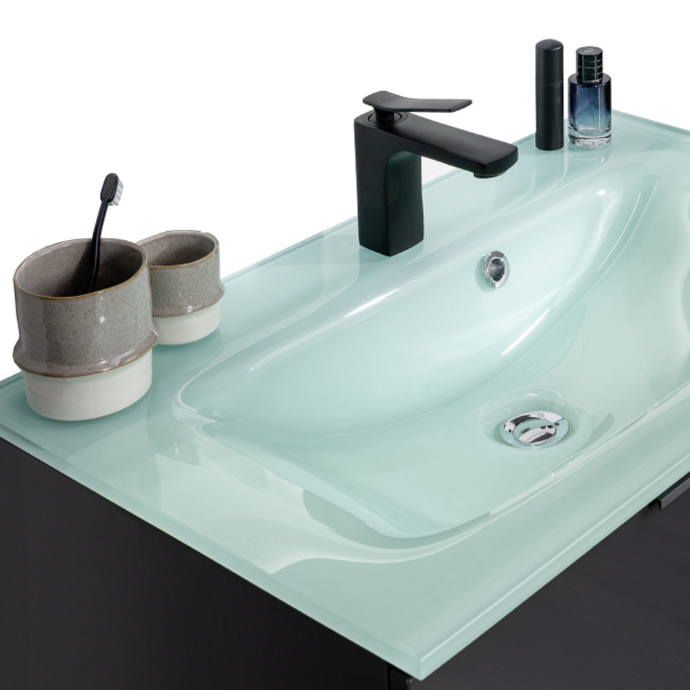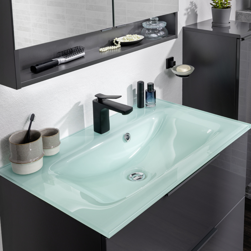 Niezależnie od wyboru, każda z dostępnych w serii umywalek, idealnie współgrać będzie z szafką o szerokości 80 cm, która posiada dwie pojemne szuflady i eleganckie, aluminiowe uchwyty, pokryte lakierem w kolorze antracytowym.