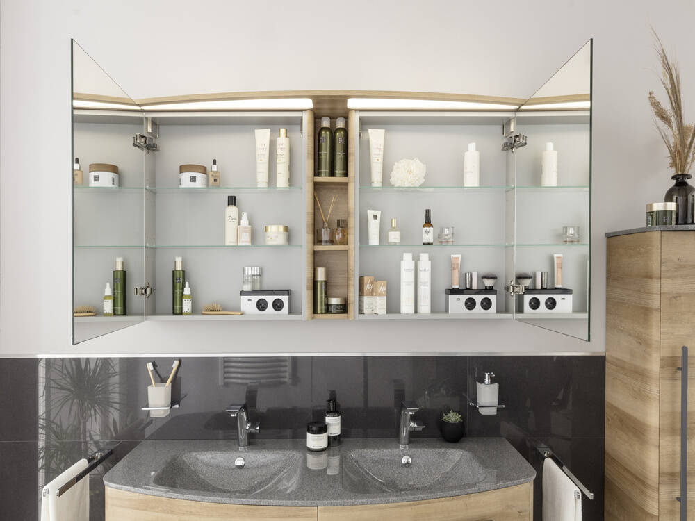 - Szafka lustrzana z efektem 3D umożliwiającym oglądanie sylwetki z każdej strony. Dodatkowo oświetlenie LED doskonale oświetli twarz podczas golenia lub makijażu.
