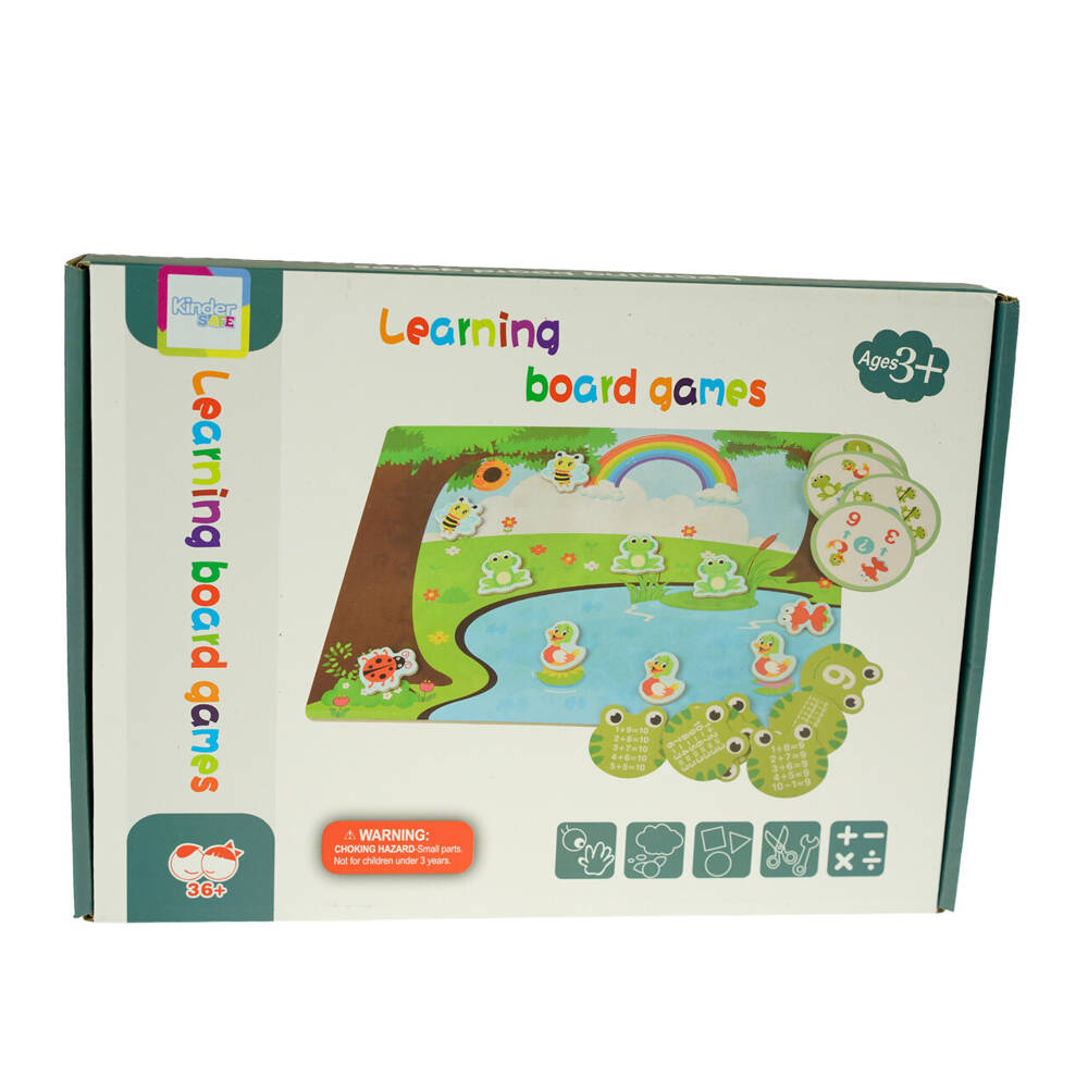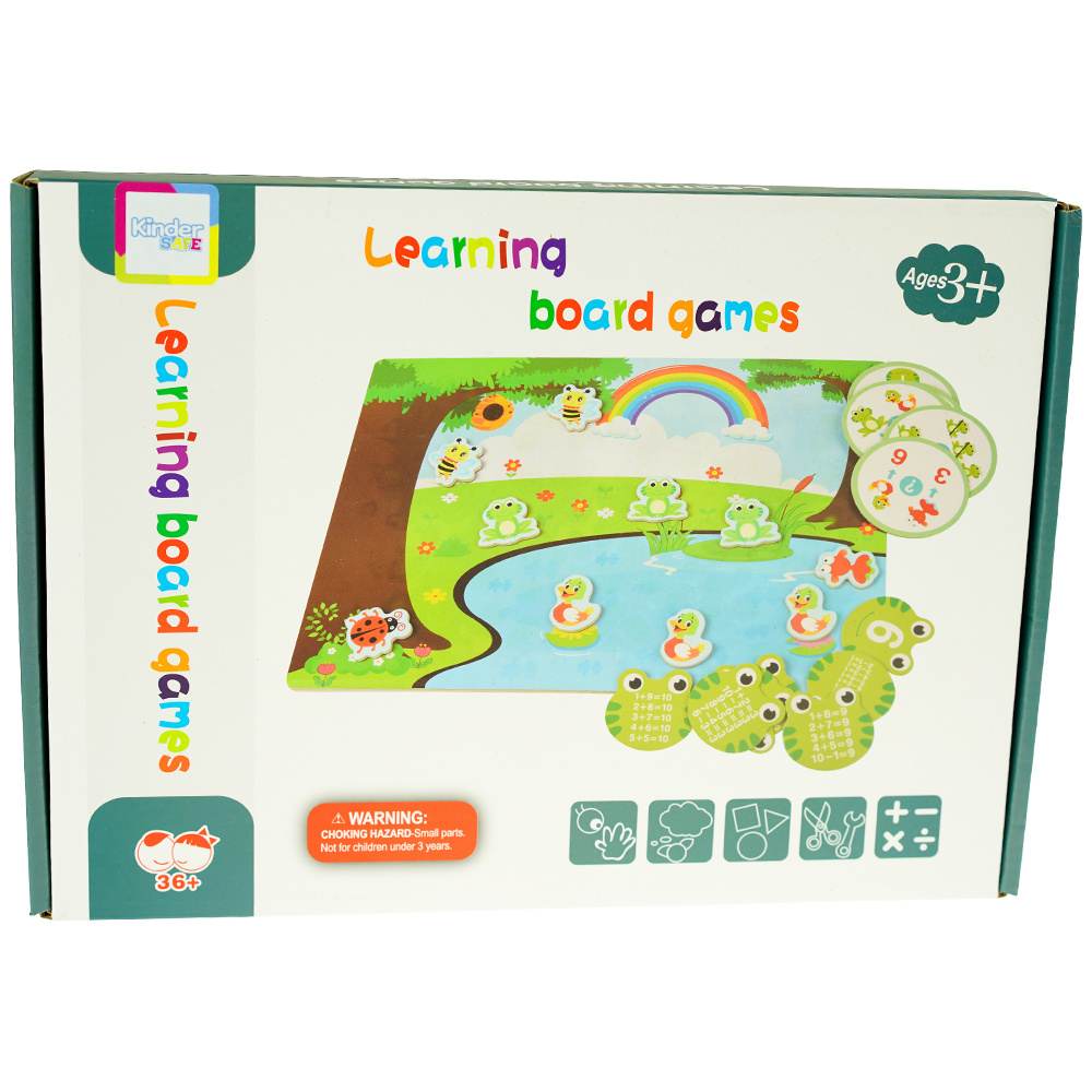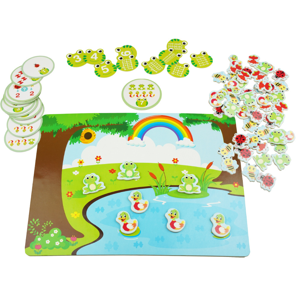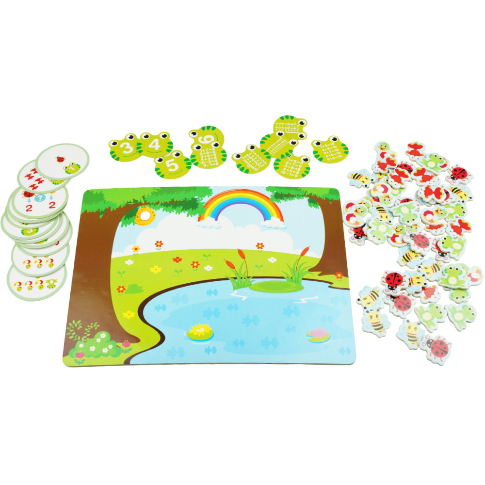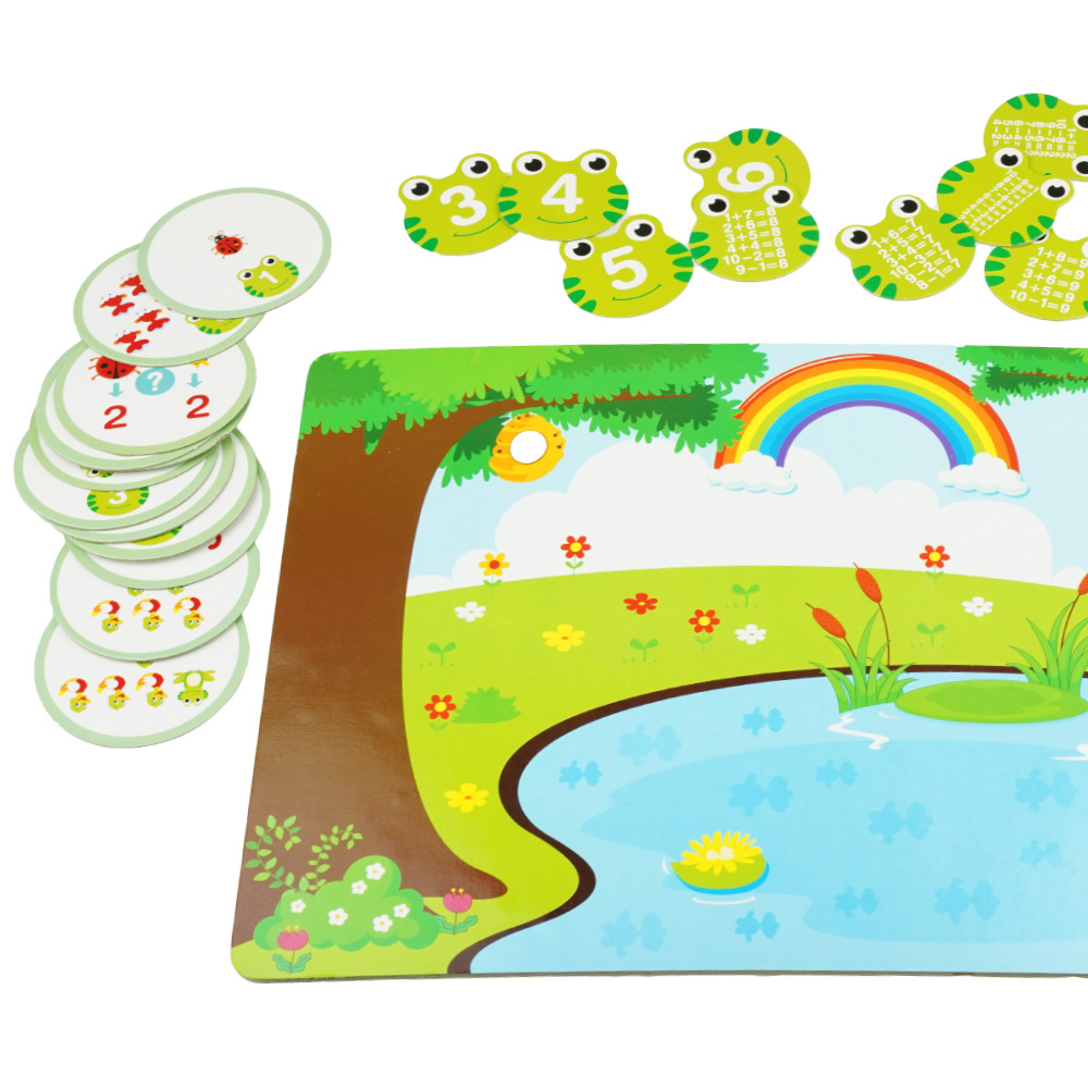 Żabki maja przypisaną określona cyfrę, na odwrocie zaś znajdują się działania matematyczne odpowiadające danej cyfrze.