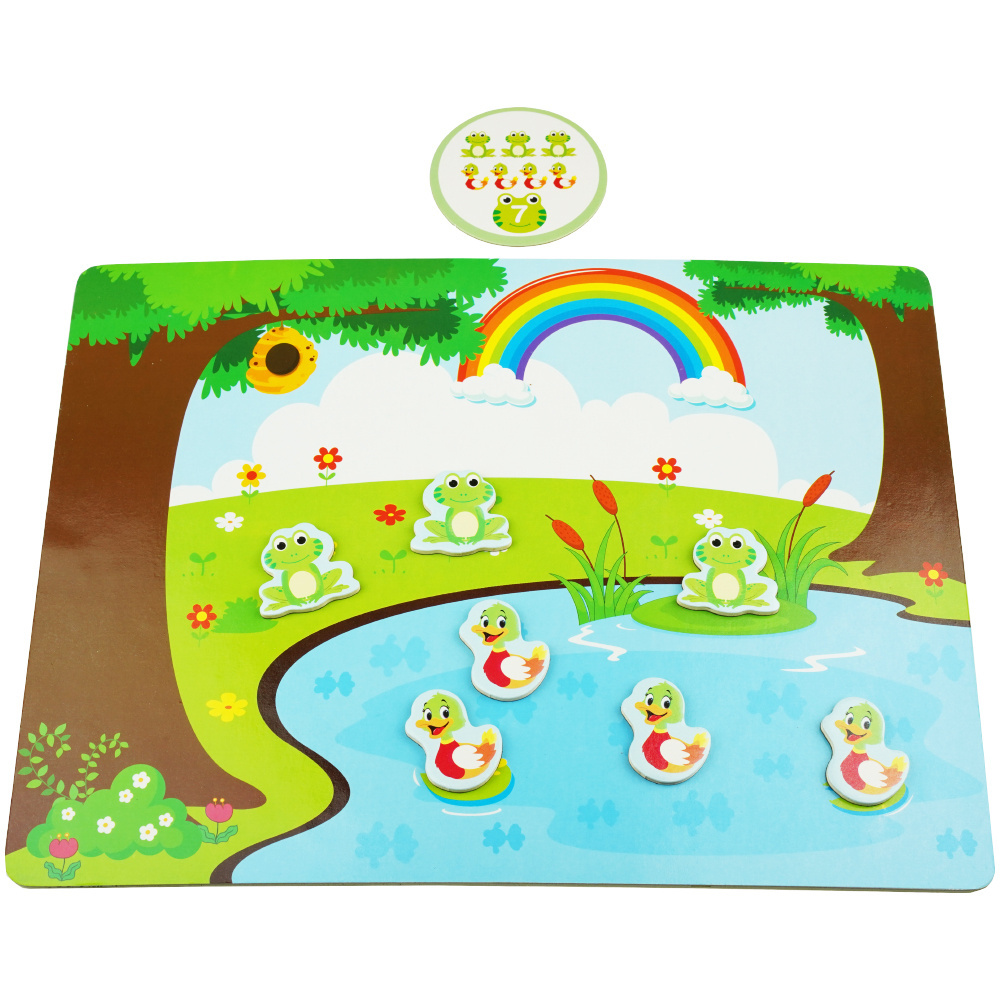 Zadaniem dziecka jest wylosować krążek, policzyć ile zwierzątek się na nim znajduje, określić jaki znak matematyczny, powinien być zastosowany oraz podać wynik. Na drewnianej podstawce dziecko przyczepia tyle magnetycznych zwierzątek ile pokazane jest na krążku.