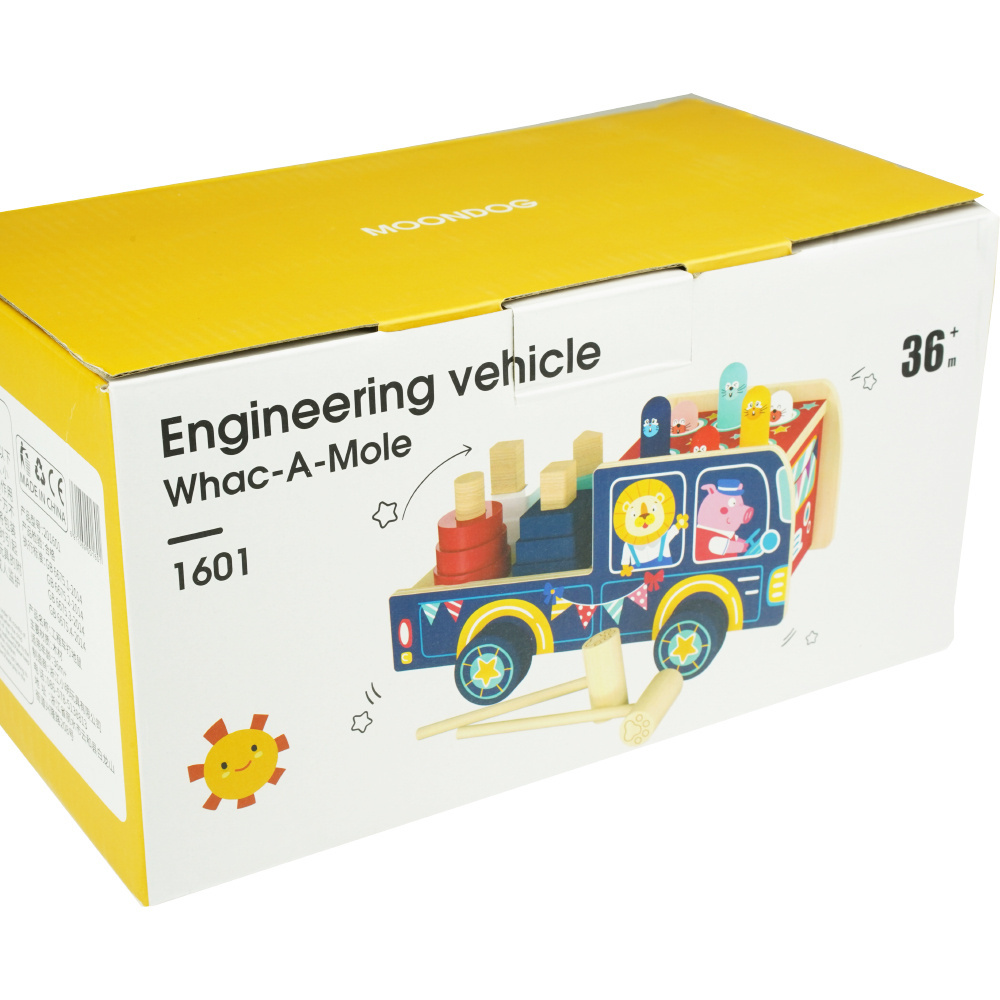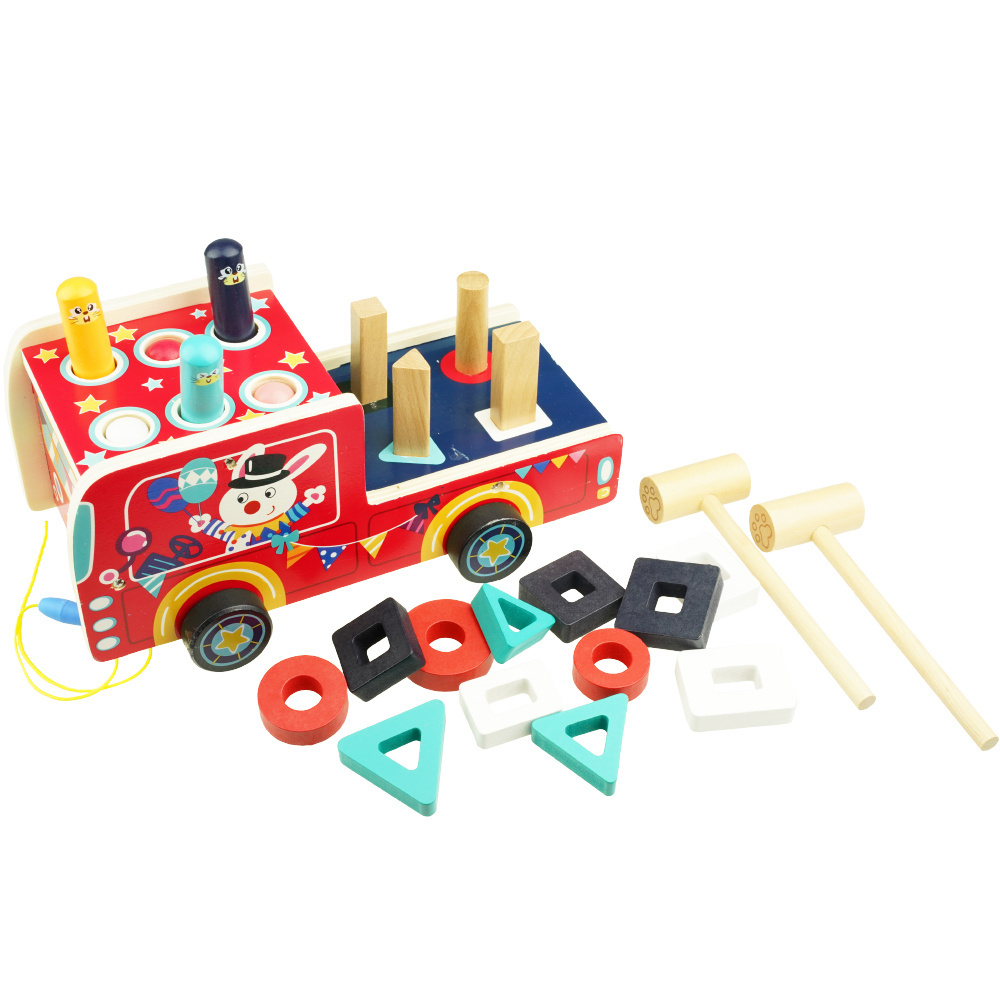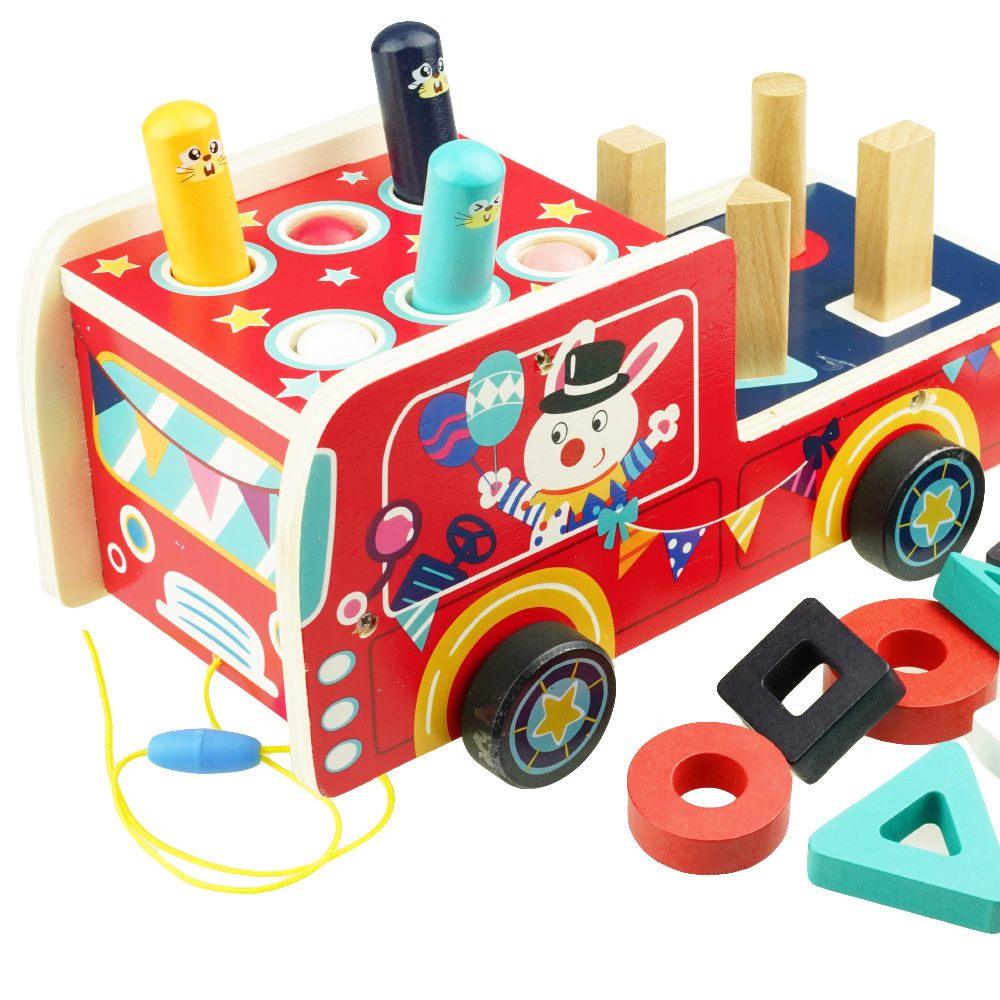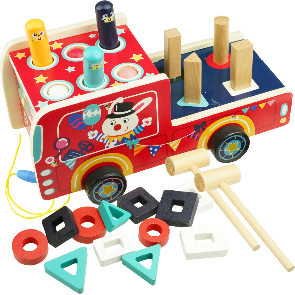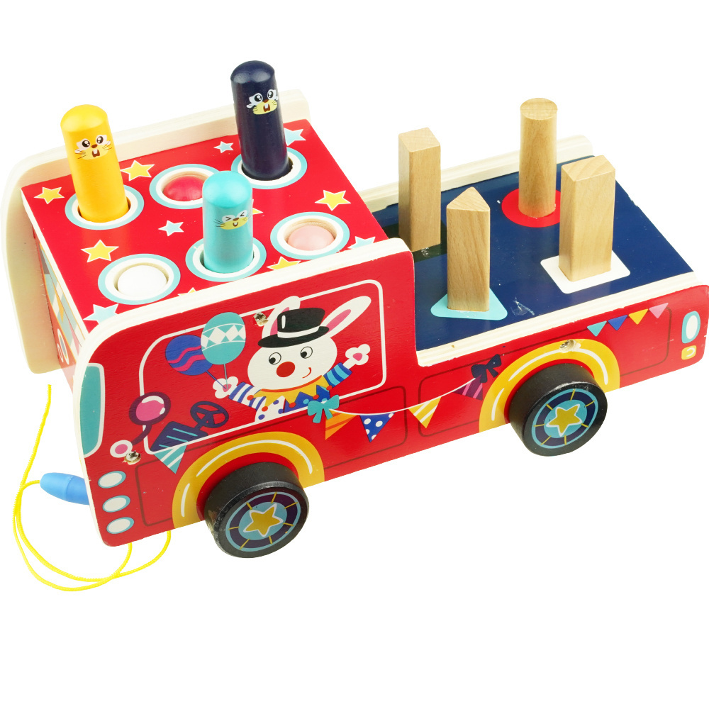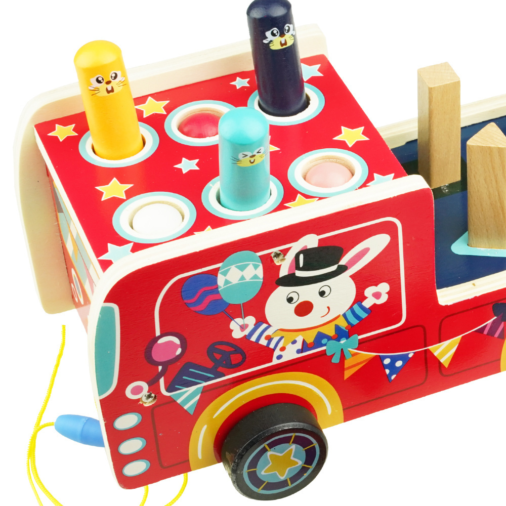 Drewniane autko do ciągania wbijak wyposażony w mechanizm dzięki któremu króliczki do wbijania samodzielnie wyskakują.