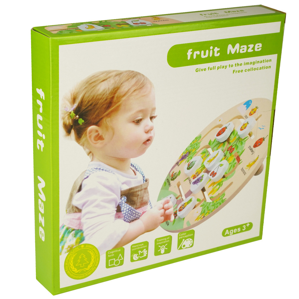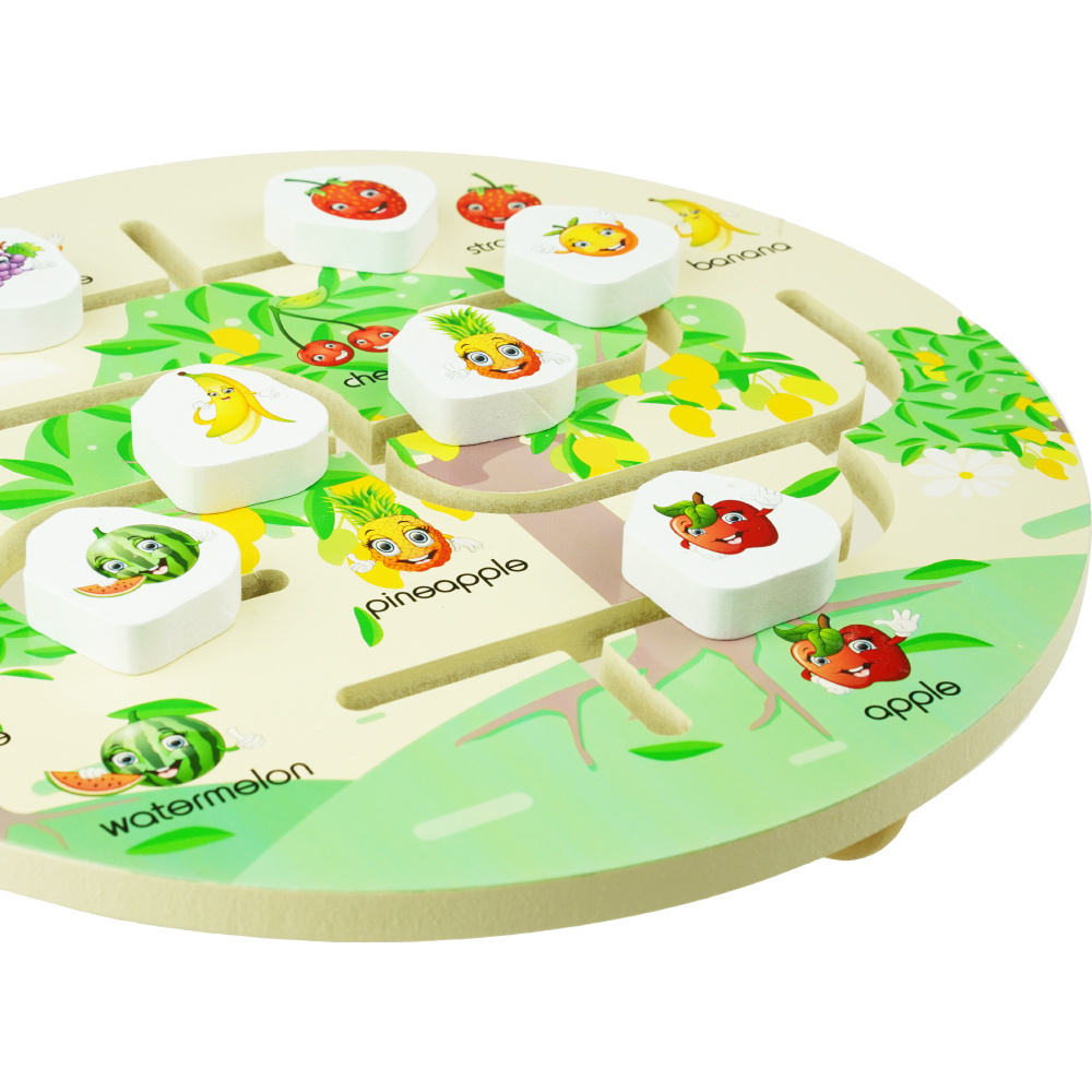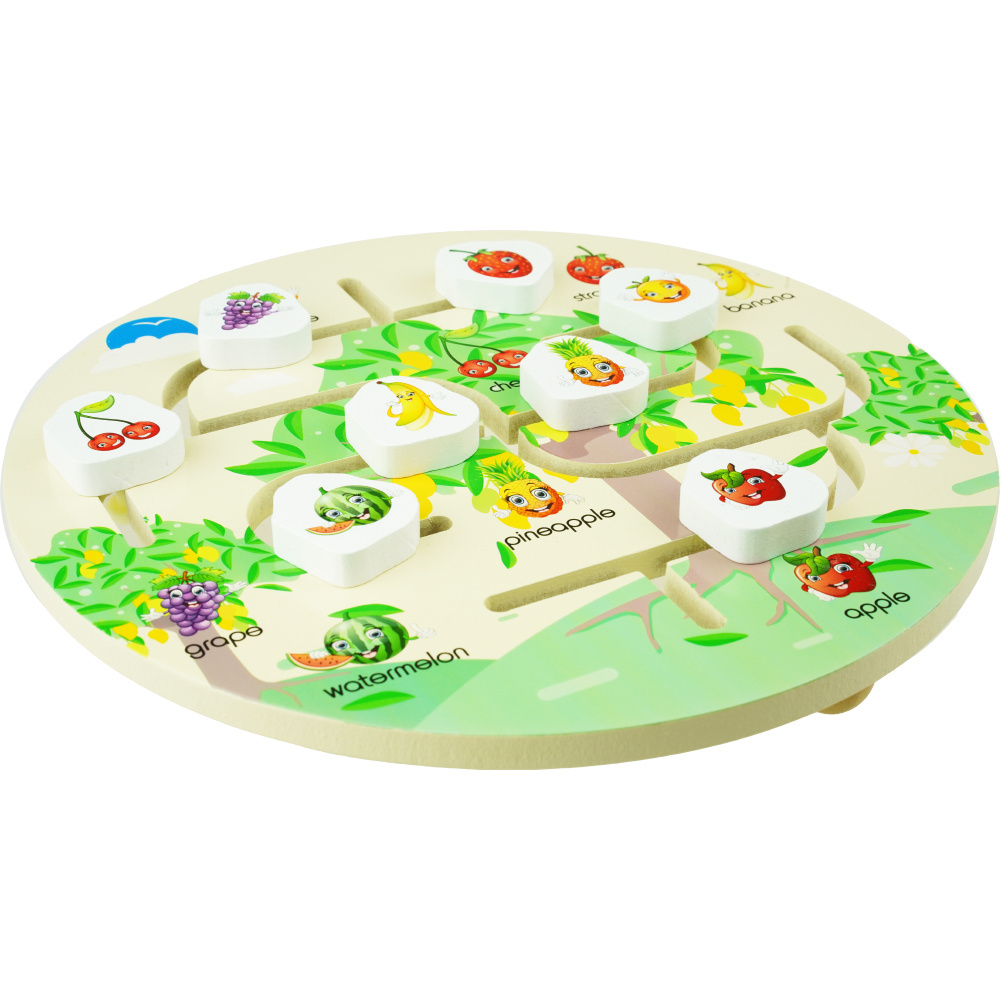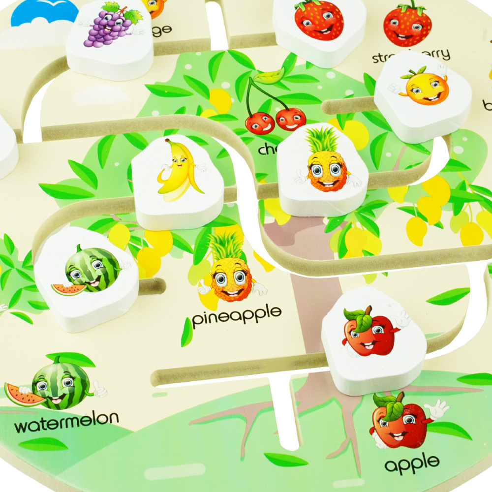 Drewniana kolorowa układanka labirynt z torem ruchu owoce to produkt przeznaczony dla najmłodszych dzieci.