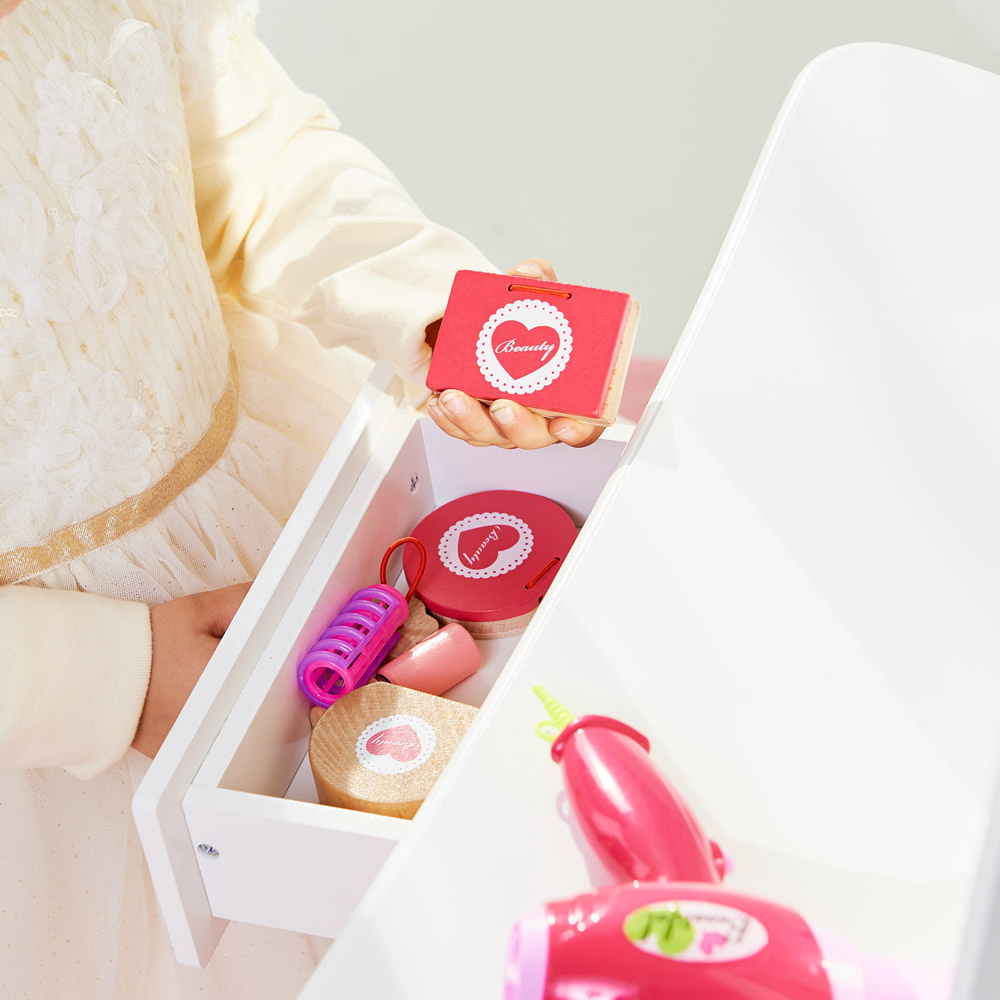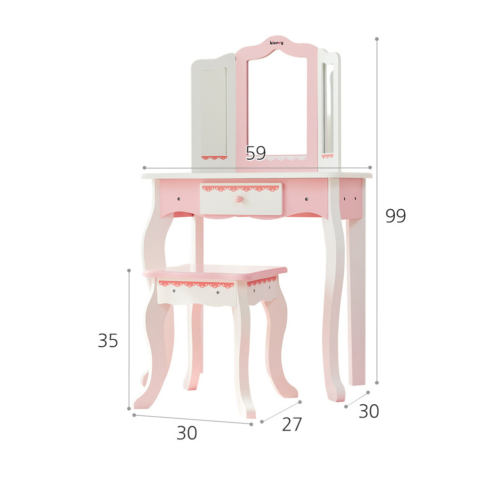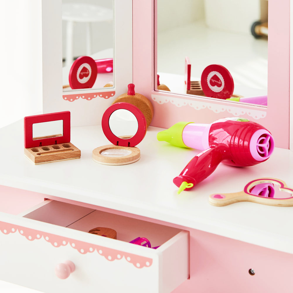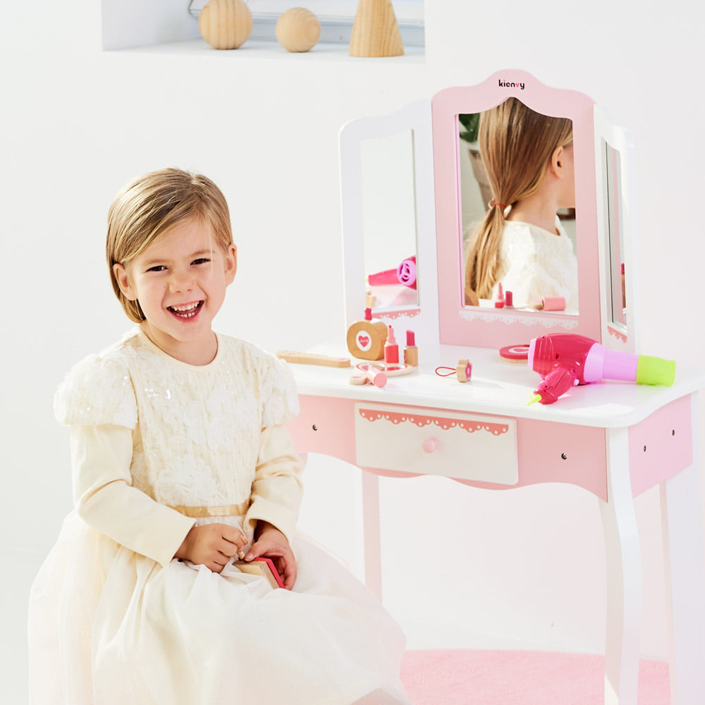 Drewniana toaletka z potrójnym lustrem oraz taborecikiem zachęci niejedną małą dziewczynkę do zabawy w salon urody. Mała księżniczka może więc śmiało naśladować swoją mamę lub siostrę. Toaletka jest niezwykle stylowa i z reguły jest ona kluczowym elementem w pokoju każdej młodej damy!