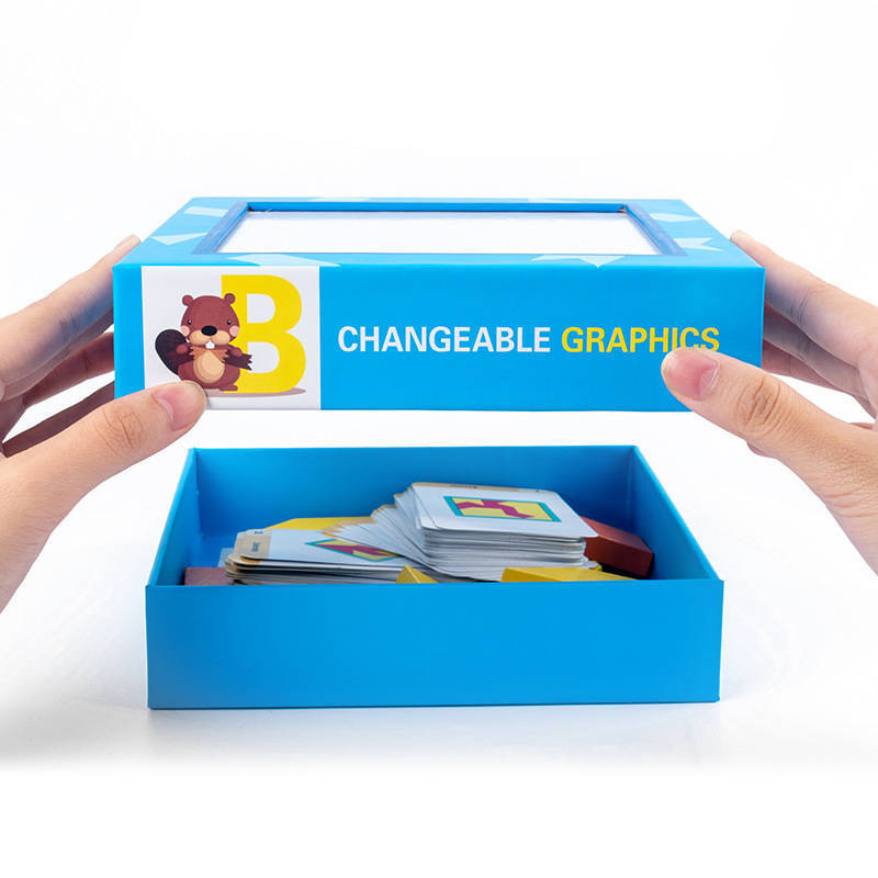 Gra zawiera 60 dwustronnych kart z wyzwaniami i rozwiązaniem o różnym poziomie trudności. Zadaniem dziecka jest odwzorowanie kształtu z wylosowanej karty używając do tego wszystkich klocków.