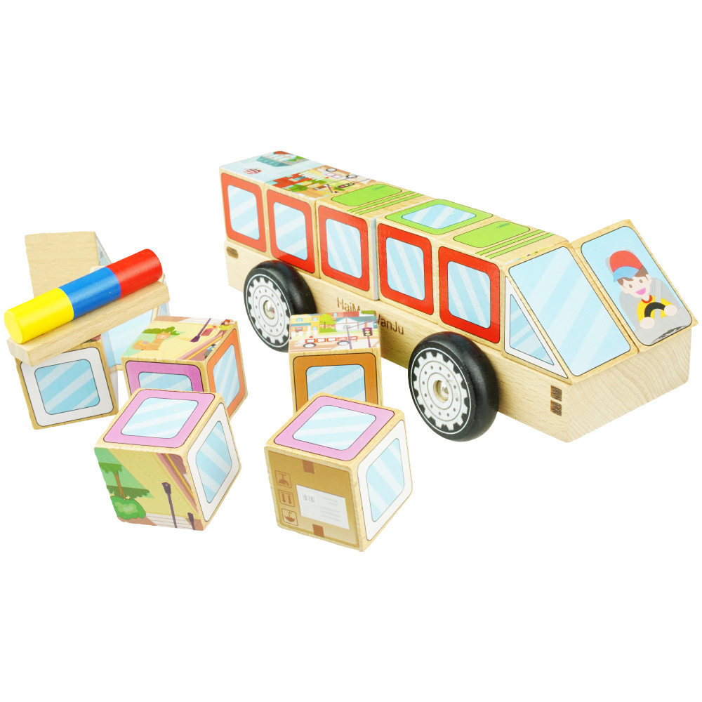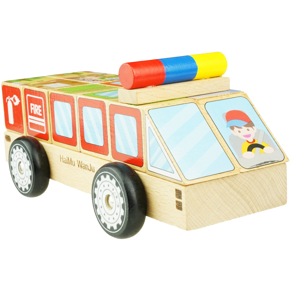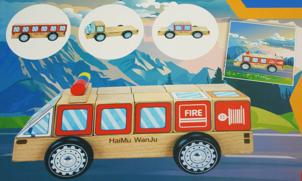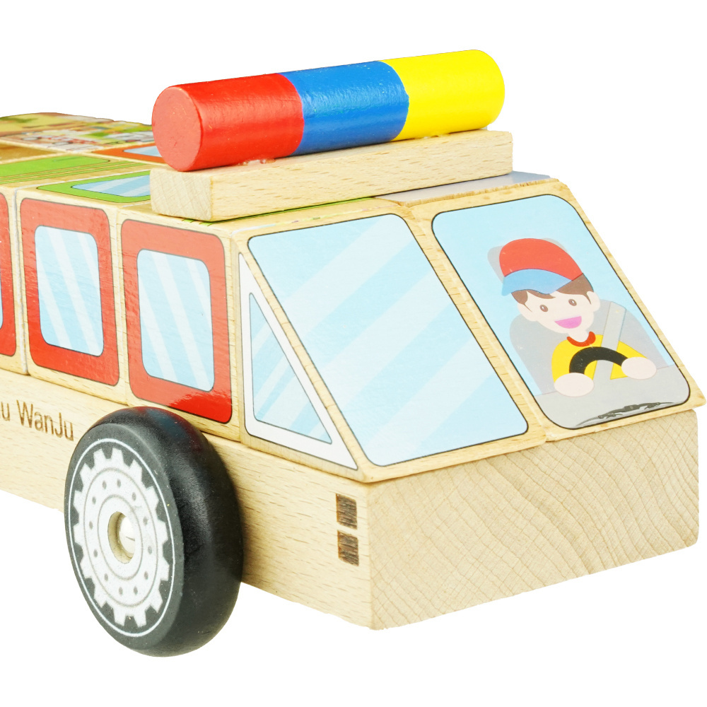Za pomocą 12 drewnianych klocków można wyczarować autobus, ciężarówkę, ambulans itp.