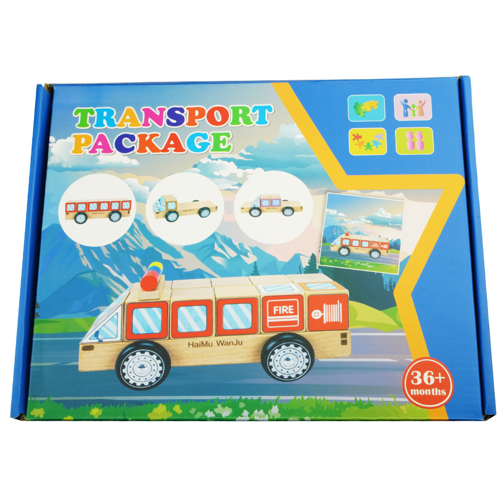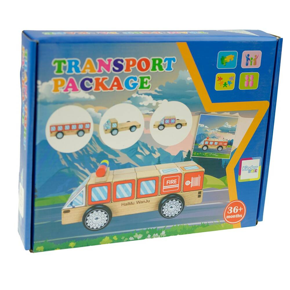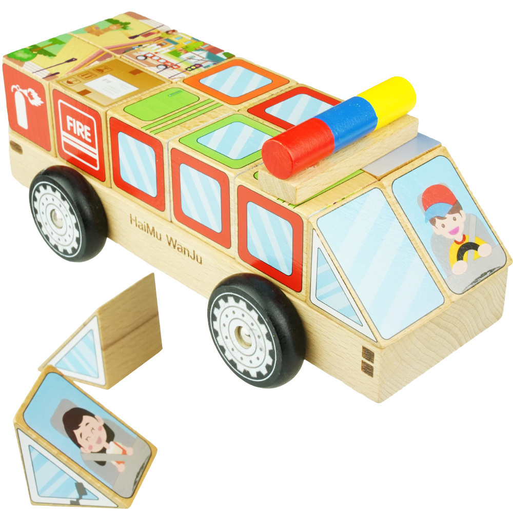 Za pomocą 12 drewnianych klocków można wyczarować autobus, ciężarówkę, ambulans itp.
