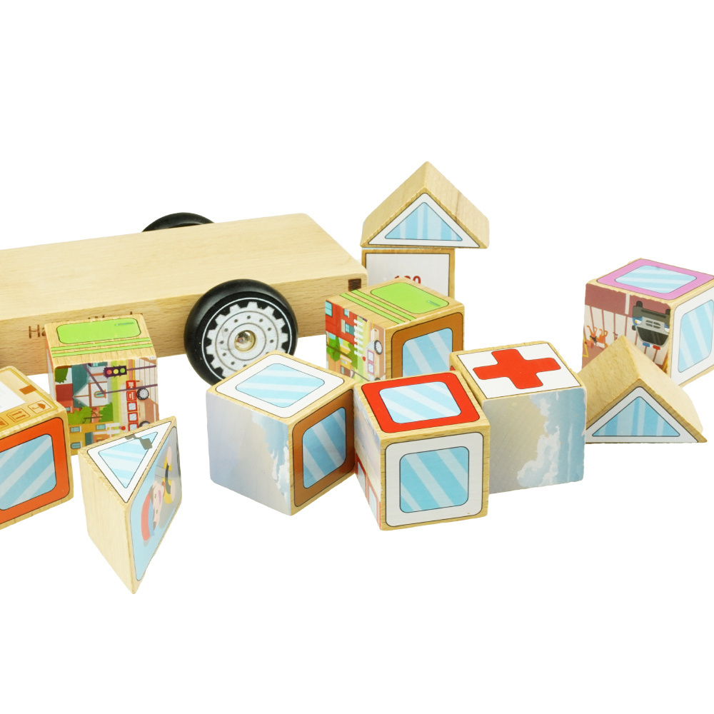 - Fantastyczna zabawa i nauka w jednym. Drewniane solidne autko z klockami do samodzielnego stworzenia pojazdów miejskich