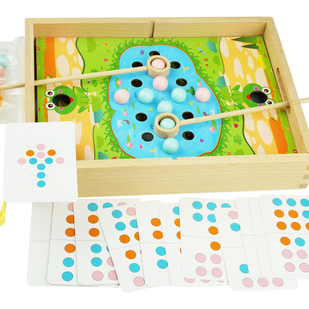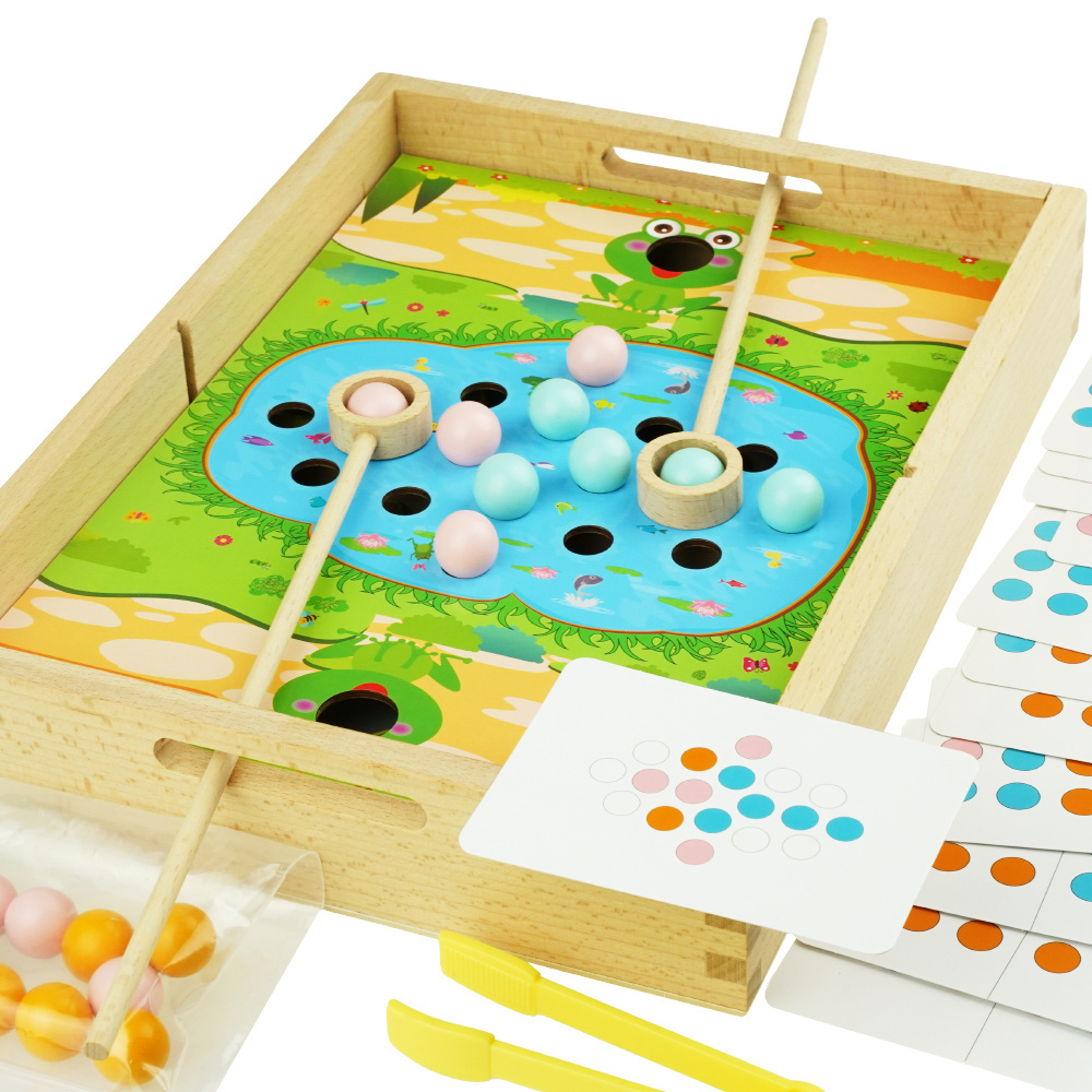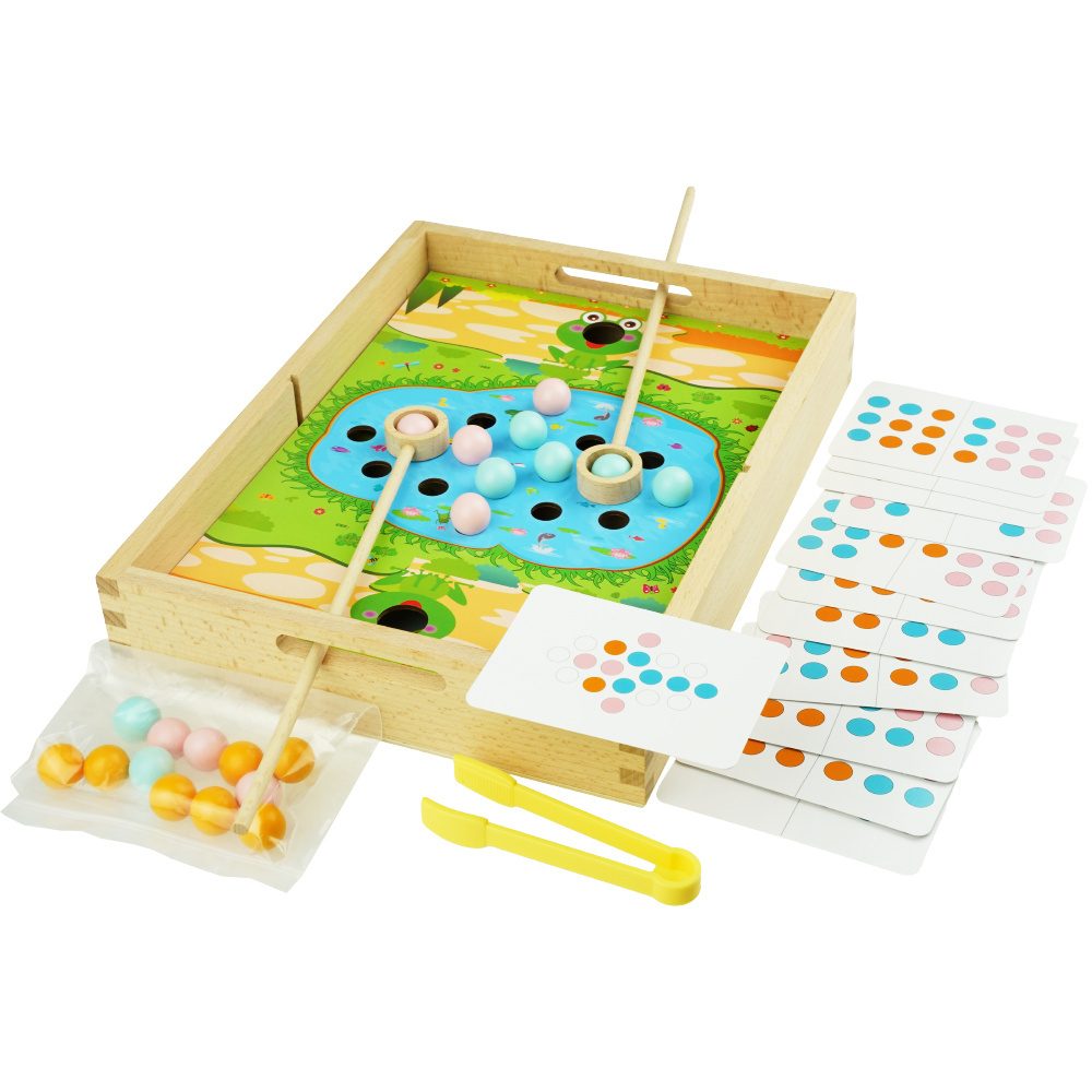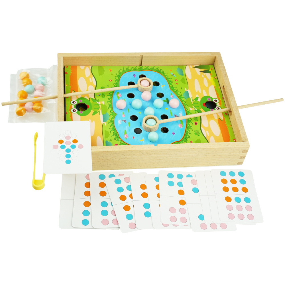 Gra jest ciekawym zestawem składającym się z 12 stworzeń morskich, 2 wędek, 12 kart, 1 dwustronna karta do układania kuleczek. oraz kolorowych kulek.