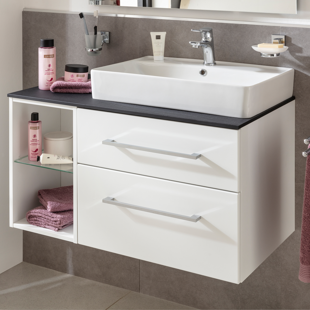 Dwa modele podstawowe szafki pod umywalkę, z szufladami o szerokości 60 cm oraz otwartą półką o szerokości 30 cm, umożliwiają stworzenie wielu wariantów do przechowywania.