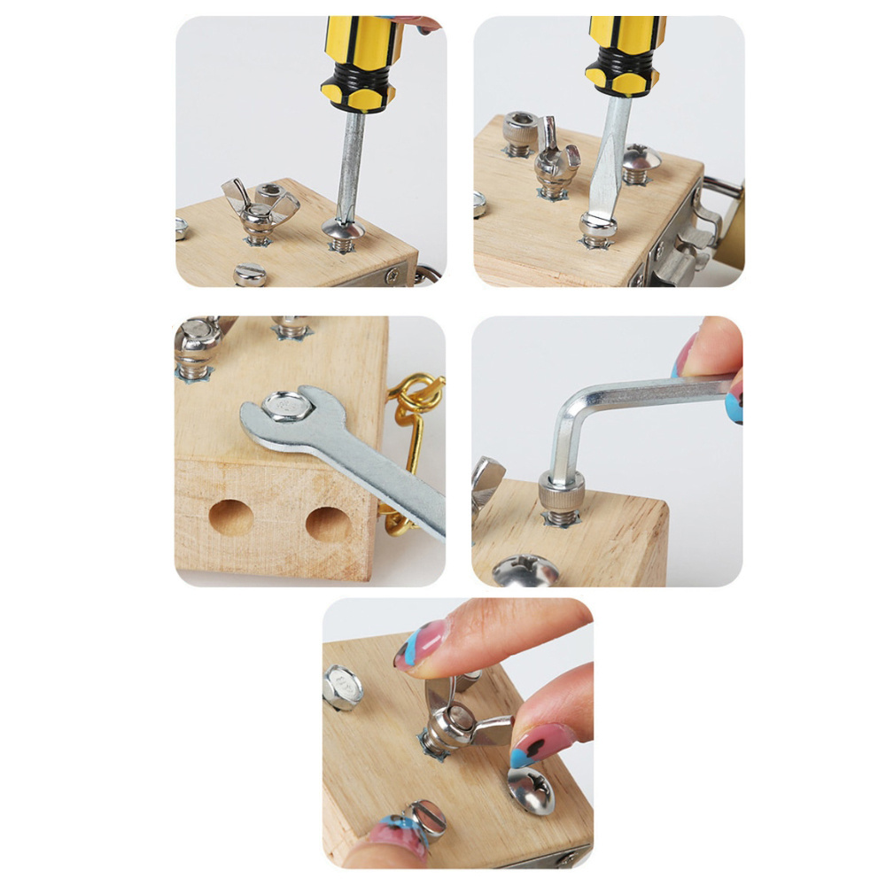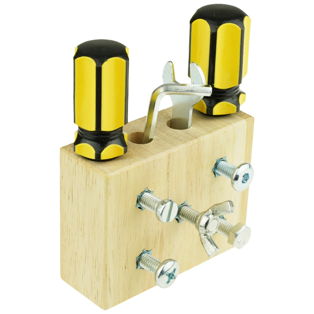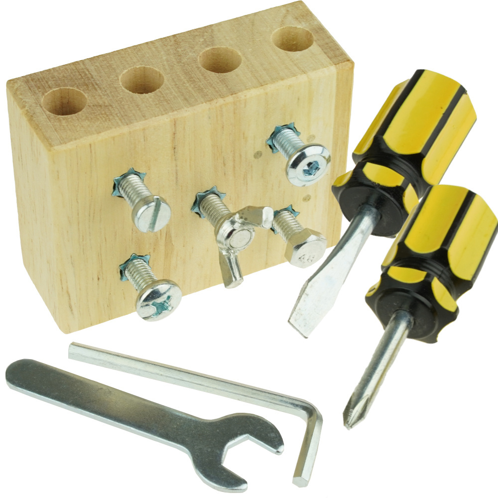 - Drewniany bloczek z czterema rodzajami śrub oraz narzędziami do nauki praktycznych umiejętności w oparciu o metodę Montessori.