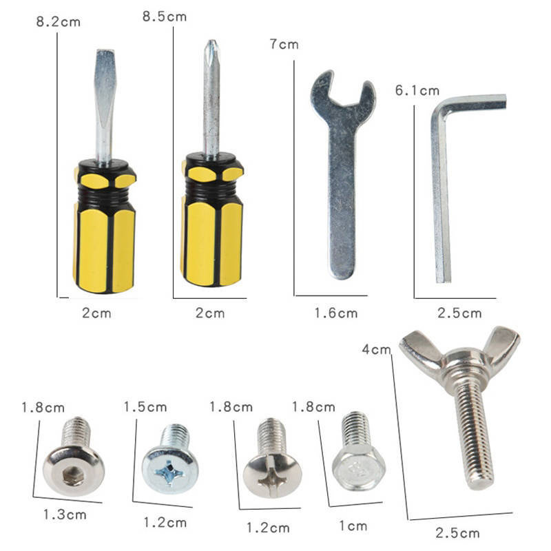 Zabawka składa się z drewnianej kostki, w którą wkręcone jest 5 różnych rodzajów śrub oraz dwóch śrubokrętów i dwóch kluczy.