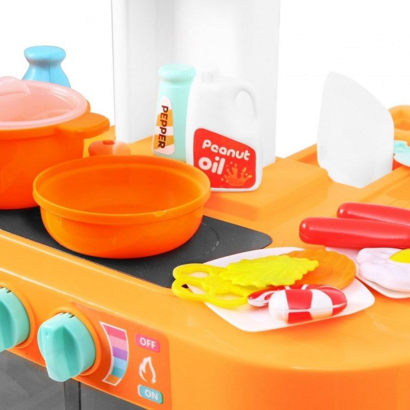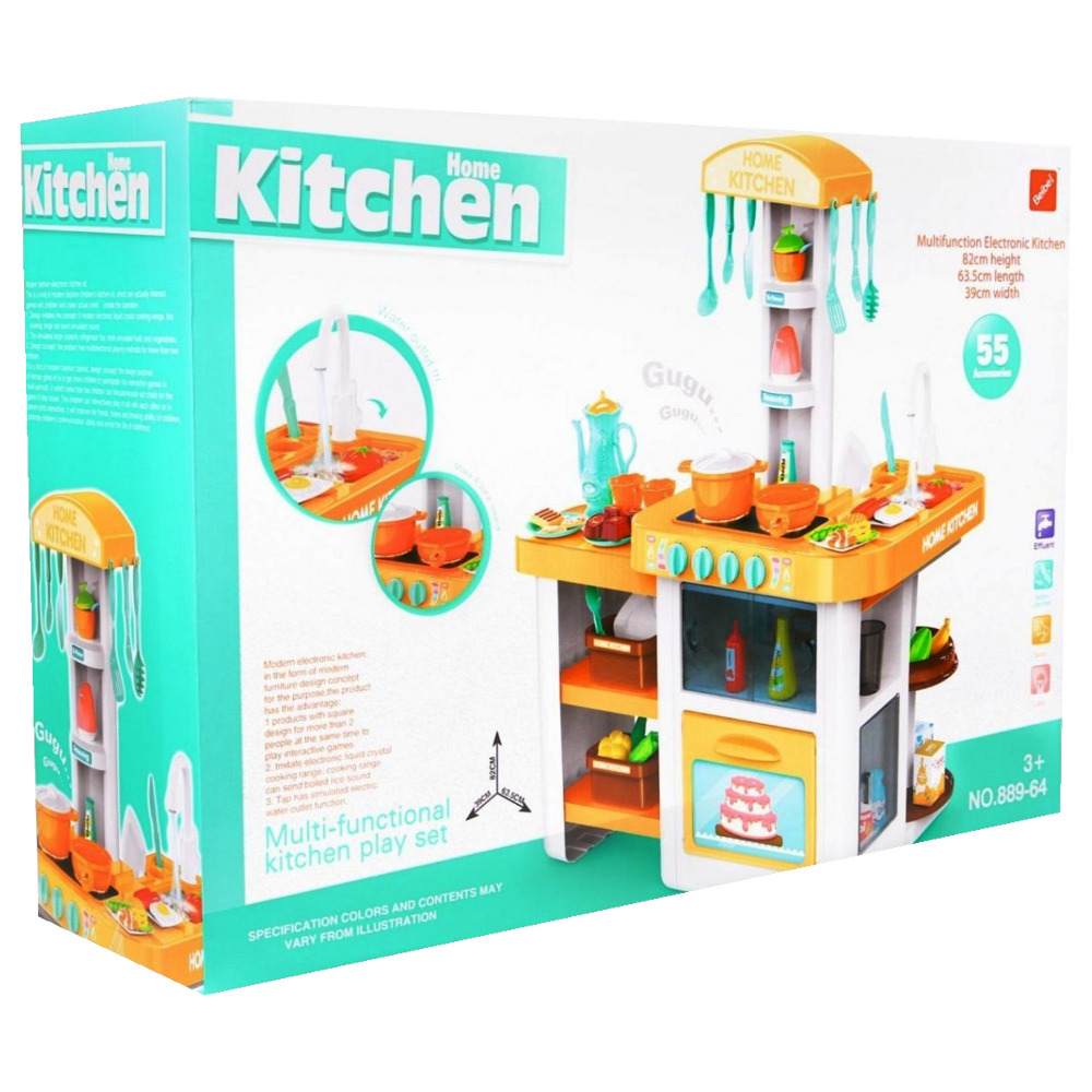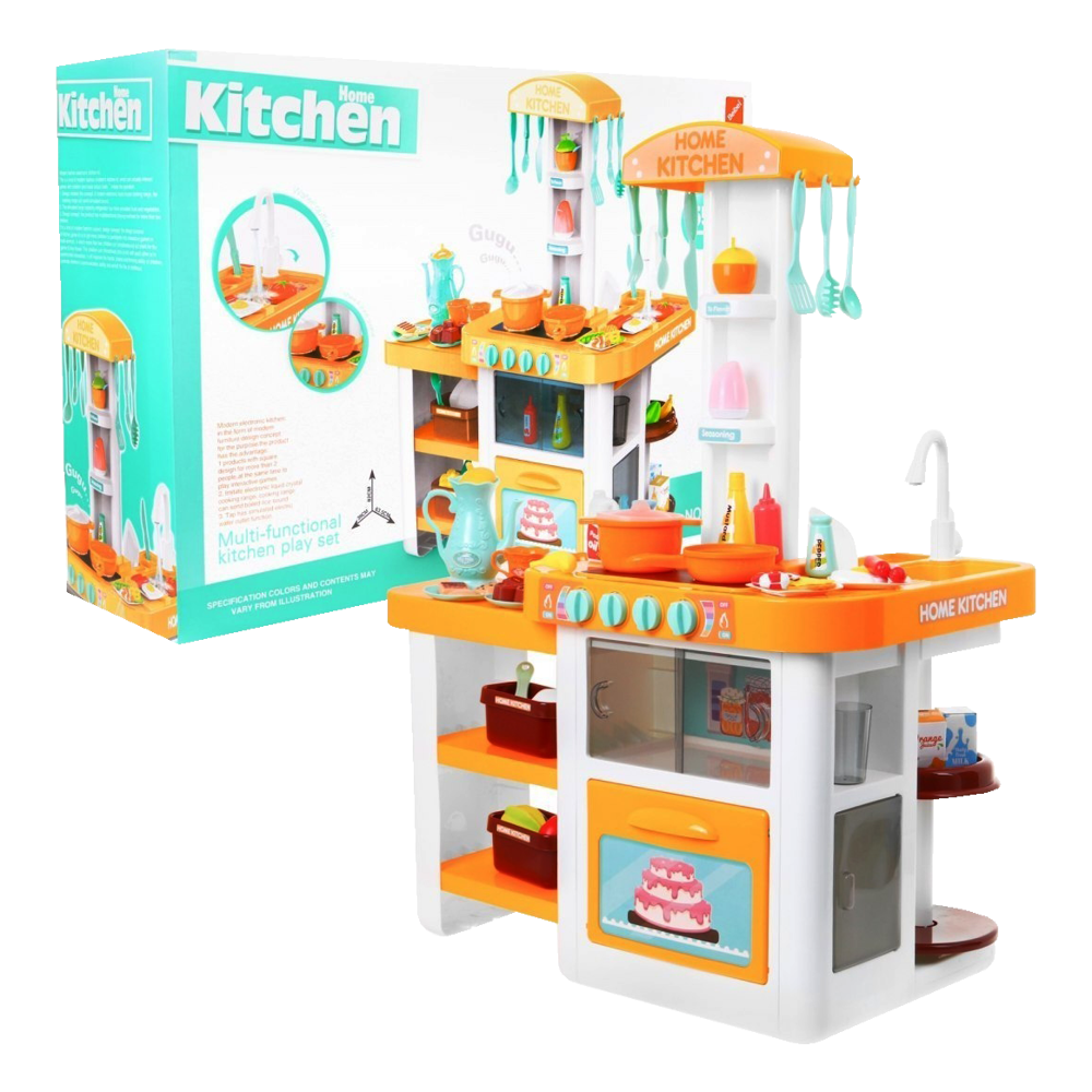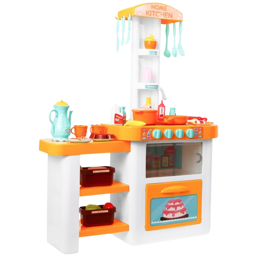 Kuchnia została wykonana z dbałością o każdy szczegół, utrzymana w ładnej kolorystyce. Wyposażona jest w płytę indukcyjną, piekarnik. Maluch może ugotować i upiec każdą potrawę! Obok kuchenki znajduje się zlew z ruchomym pokrętłem oraz lejącą się z niego wodą oraz blat roboczy. Wszystko jak w prawdziwej kuchni. Po skończonej zabawie maluch musi posprzątać, pozmywać, wytrzeć swoje przybory i poukładać je na półeczkach.