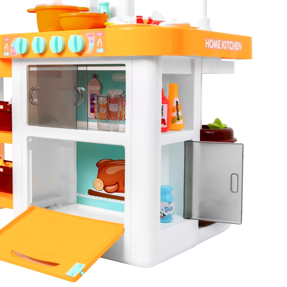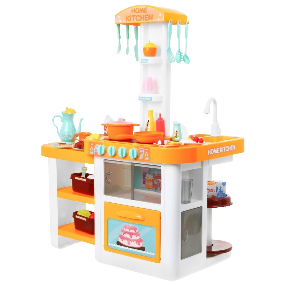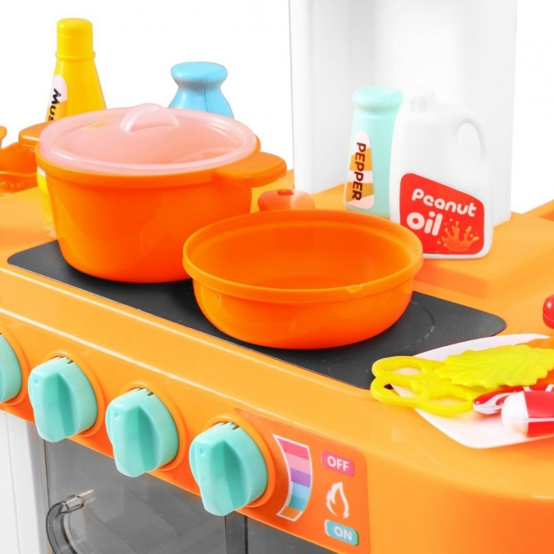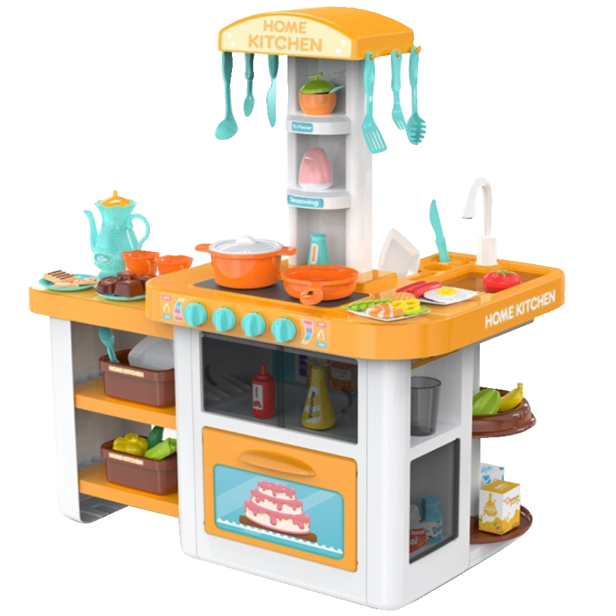 Kuchnia została wykonana z dbałością o każdy szczegół, utrzymana w ładnej kolorystyce. Wyposażona jest w płytę indukcyjną, piekarnik. Maluch może ugotować i upiec każdą potrawę! Obok kuchenki znajduje się zlew z ruchomym pokrętłem oraz lejącą się z niego wodą oraz blat roboczy. Wszystko jak w prawdziwej kuchni. Po skończonej zabawie maluch musi posprzątać, pozmywać, wytrzeć swoje przybory i poukładać je na półeczkach.