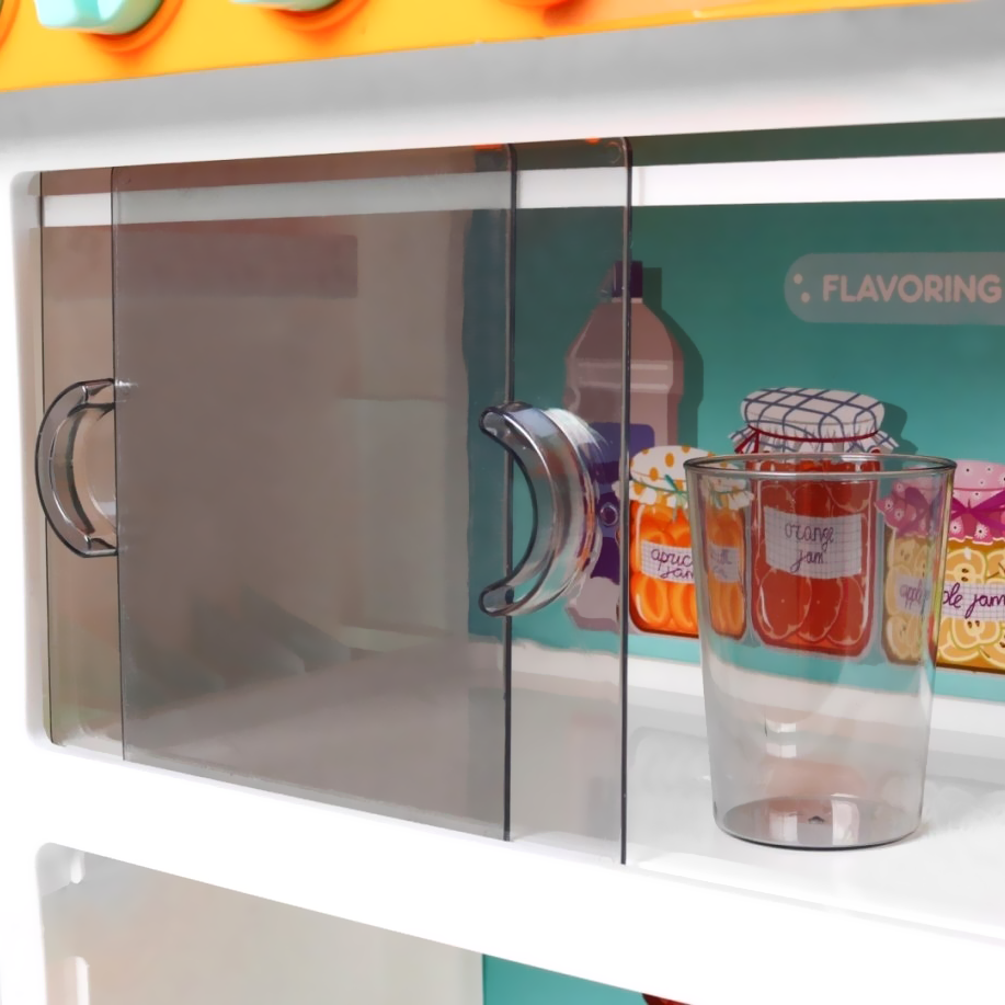 Kuchnia wyposażona jest w lodówkę z otwieranymi drzwiczkami i półeczkami, w których maluch może poukładać artykuły spożywcze. Półeczki można przestawiać na rożne poziomy. Obok lodówki są półeczki, na których można postawić dołączone koszyczki i poukładać w nim akcesoria.
