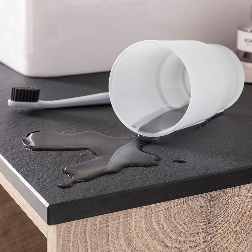 Asortyment tej serii jest bardzo bogaty. Znajdziemy tu blaty na szafki łazienkowe o grubości 12 mm o czterech różnych długościach (60, 90, 120 i 150), w czarnym stylowym dekorze ze strukturą łupka.