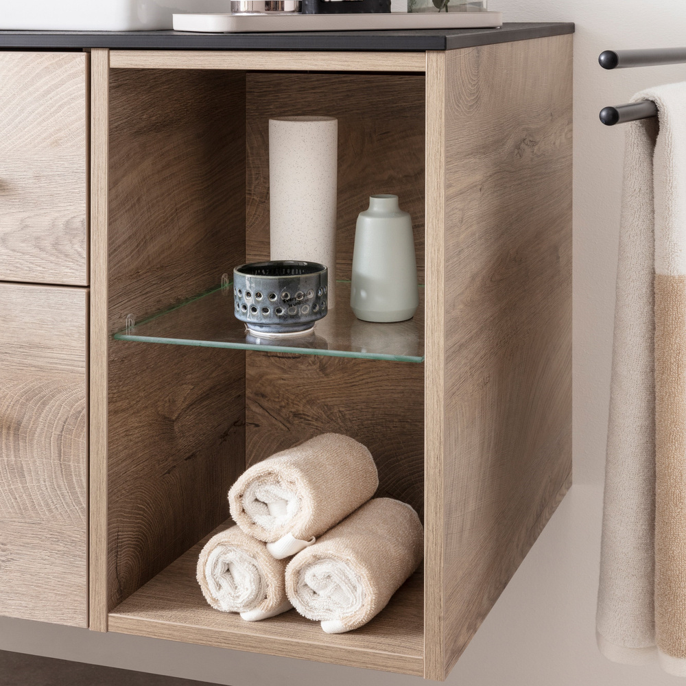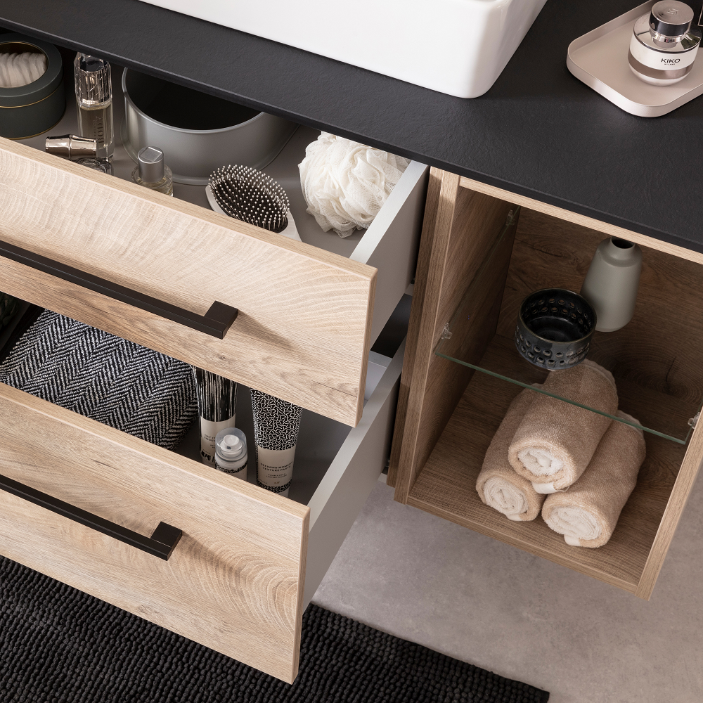Dwa modele podstawowe, szafka pod umywalkę z szufladami o szerokości 60 cm oraz otwartej półce o szerokości 30 cm, umożliwia stworzenie wielu wariantów do przechowywania.