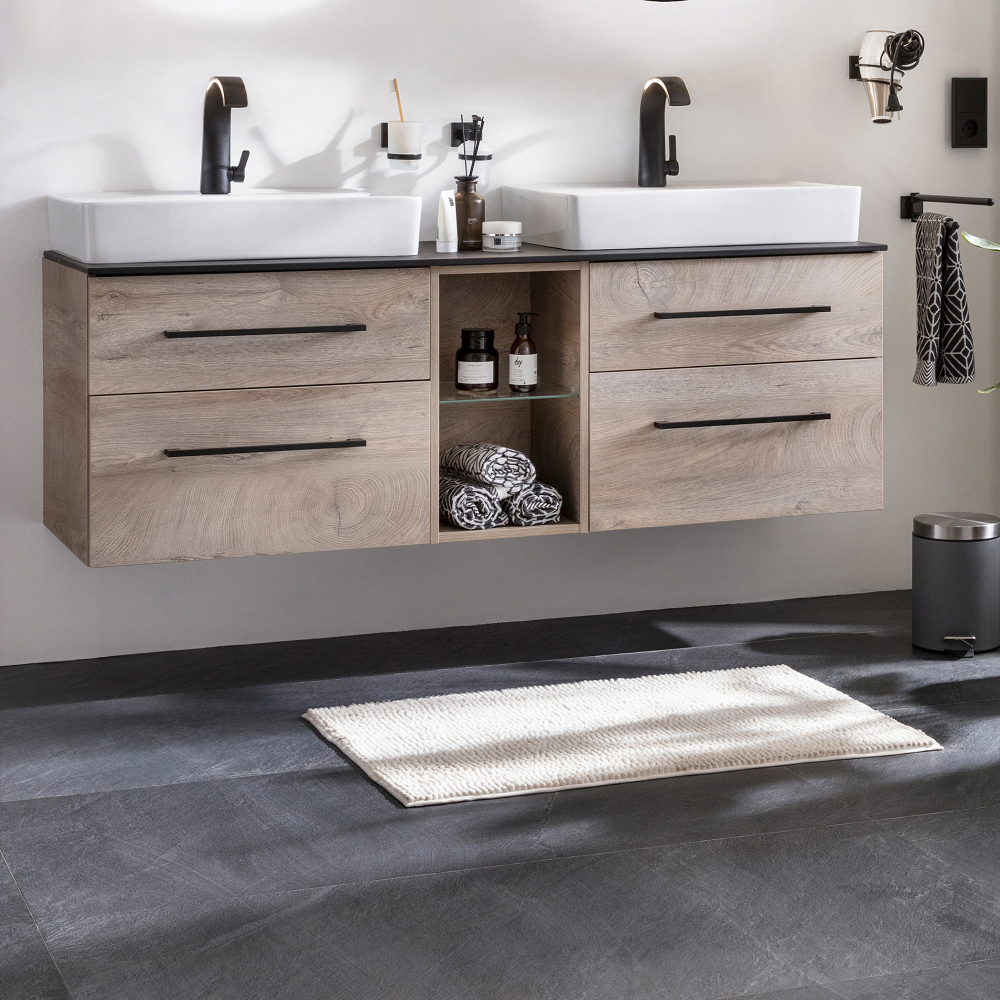 - Zestaw mebli łazienkowych z serii Oxford, w skład którego wchodzą: dwie szafki pod umywalkę z regałem, blat oraz dwie umywalki ceramiczne.