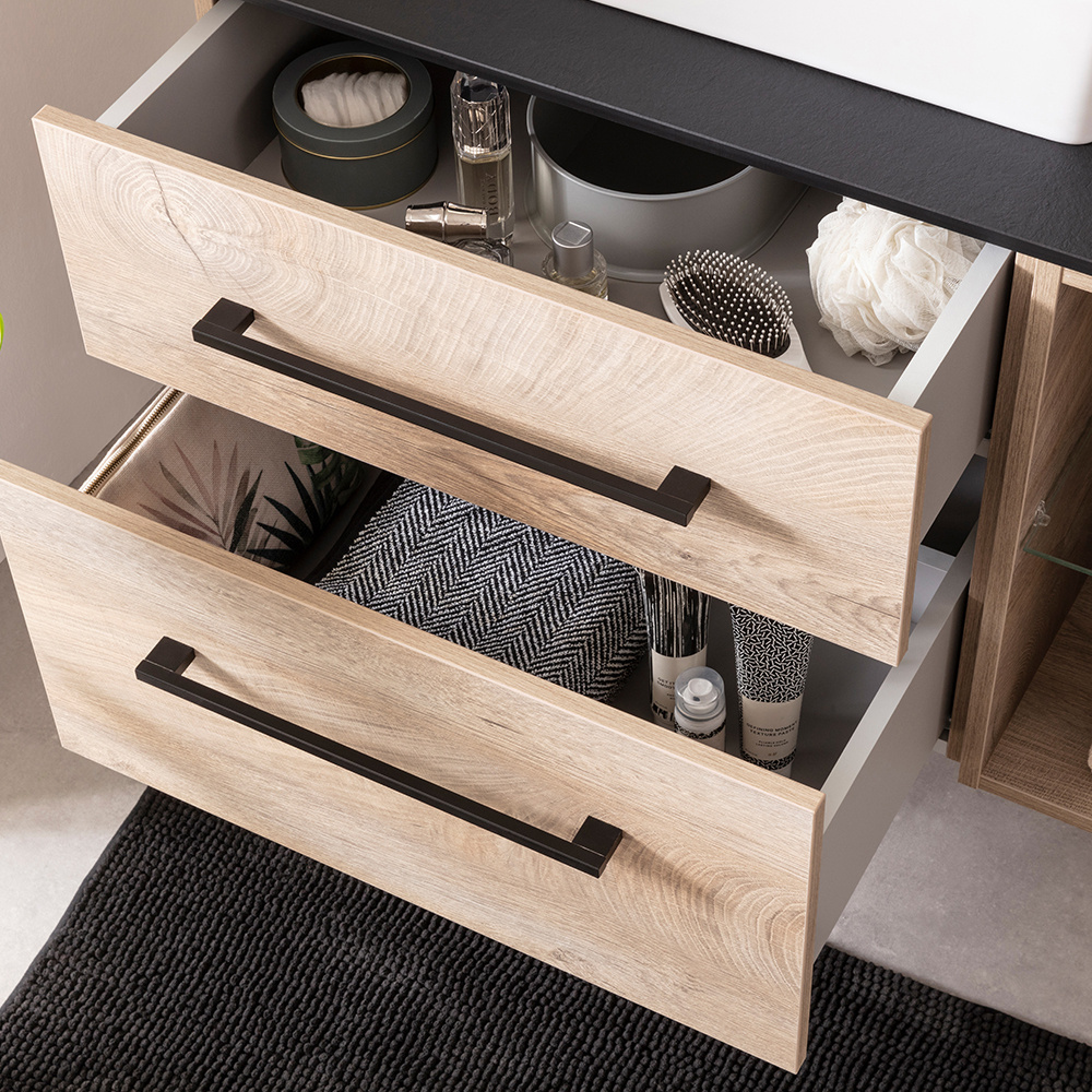 Każda z szafek posiada korpus oraz front w kolorze dąb naturalny, 2 szuflady oraz system cichego domykania.