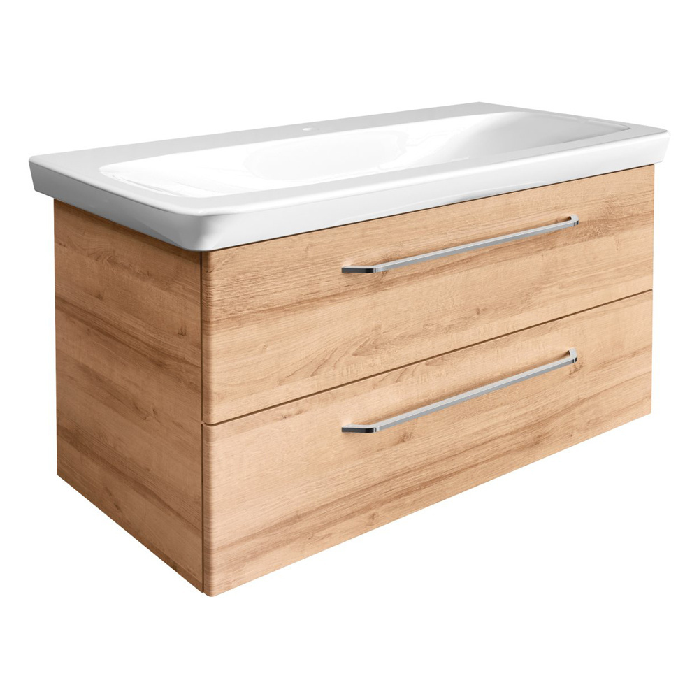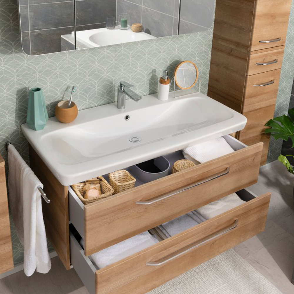 Designerskie, ceramiczne umywalki dostępne w trzech różnych wariantach idealnie pasują do dedykowanych im szafek, a zamontowanie pod nimi oświetlenia LED ConturaLight (opcjonalnie) dodaje im charakteru oraz wyrazistości. Szafki podumywalkowe występują w szerokościach: 52 cm - podwójne drzwiczki, 80 cm oraz 100 cm - dwie samodomykające się, funkcjonalne szuflady.