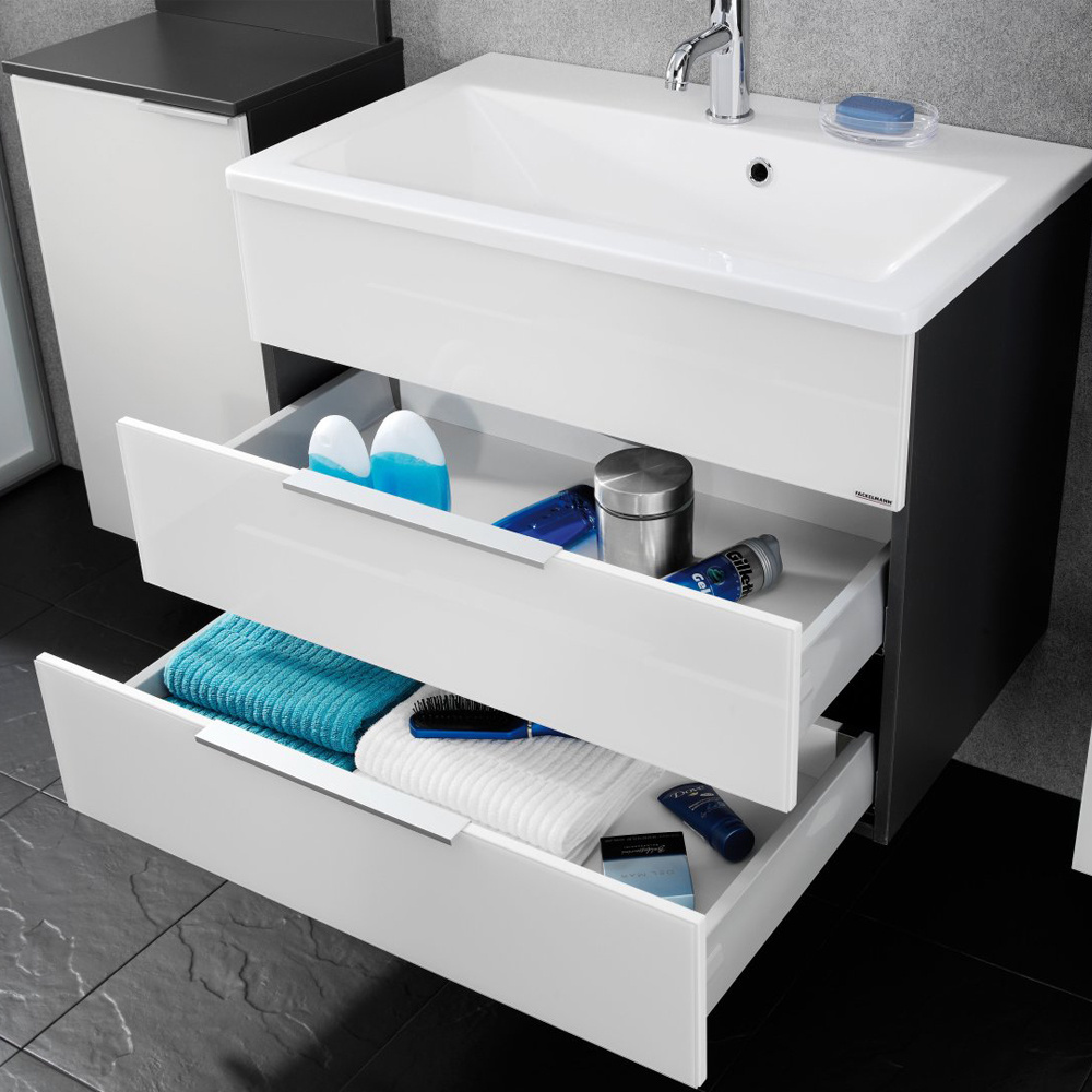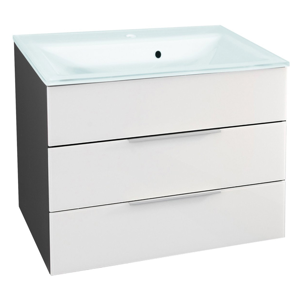 - Szafka wisząca pod umywalkę o szerokości 79,4 cm z korpusem w kolorze antracytowym oraz frontem z białego, lakierowanego szkła.