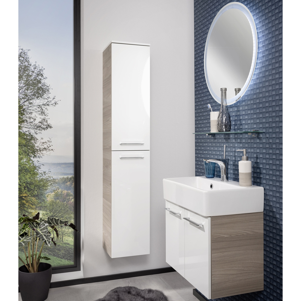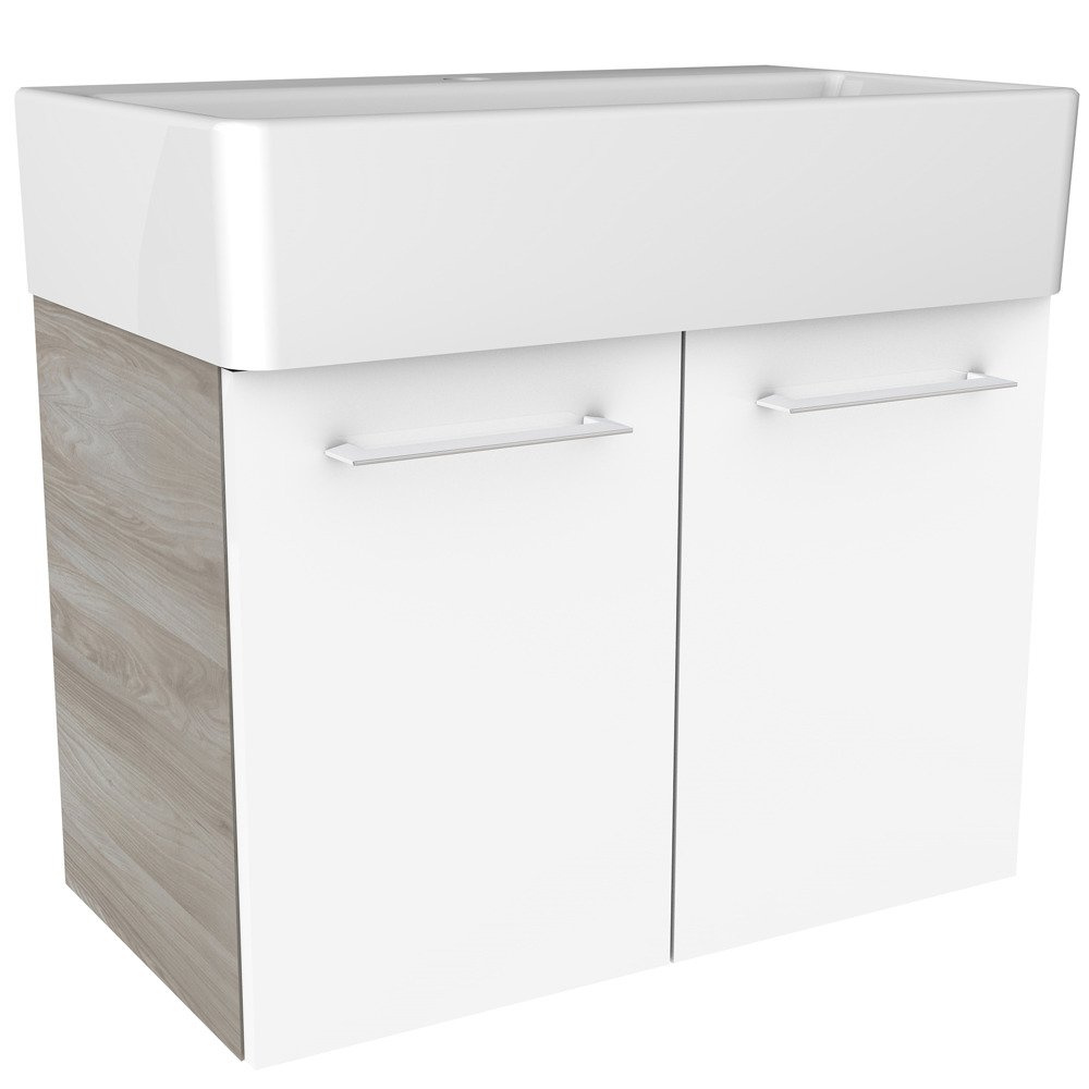 - Szafka łazienkowa pod umywalkę o szerokości 58,6 cm. Korpus w kolorze szary dąb, front w kolorze biały wysoki połysk.