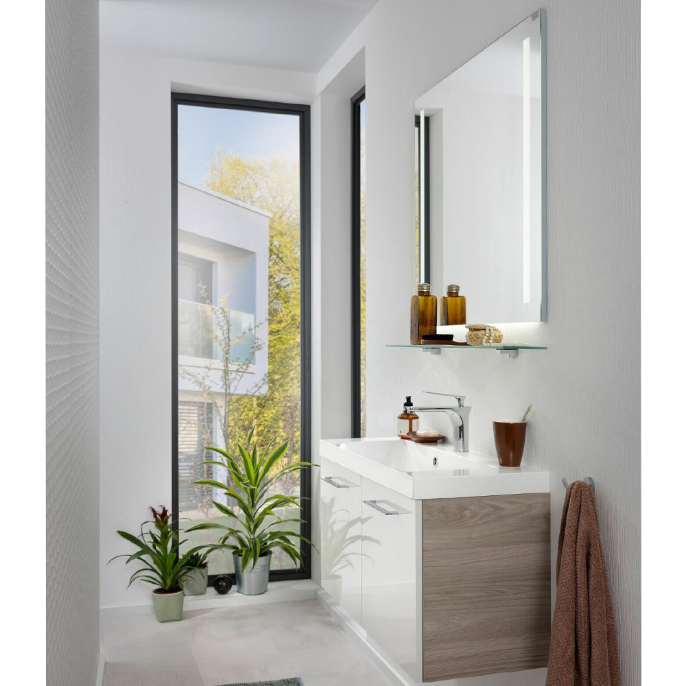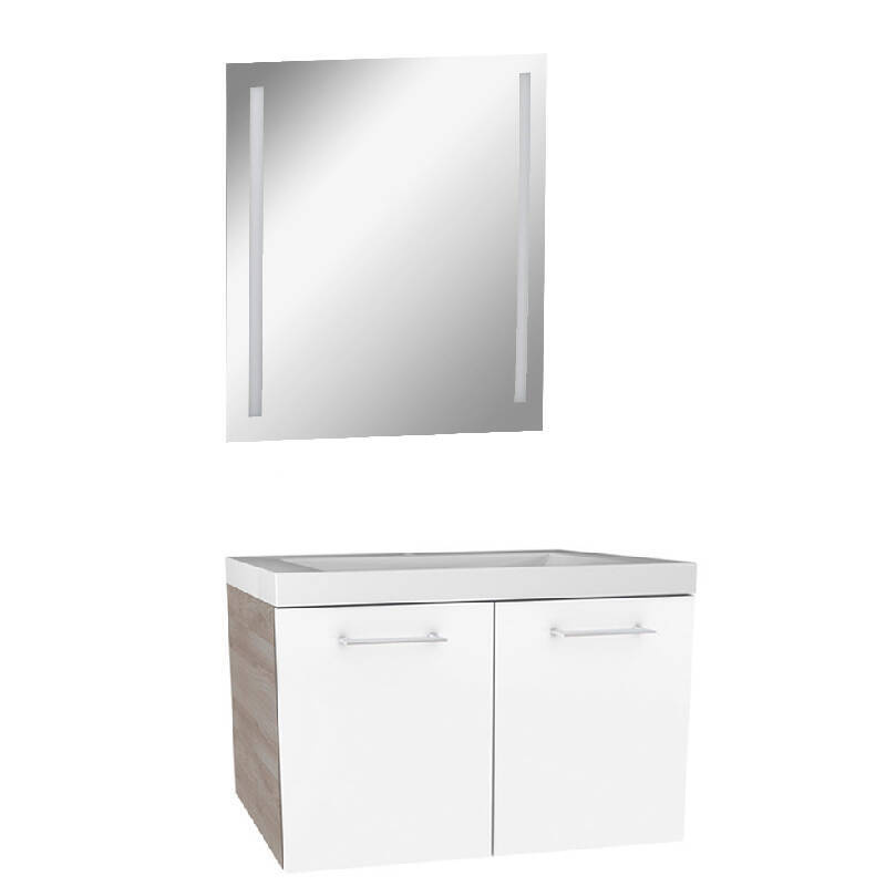 - Zestaw mebli łazienkowych z serii Lima, w skład którego wchodzą: lustro oraz szafka pod umywalkę o szerokości 79,8 cm z umywalką z konglomeratu.