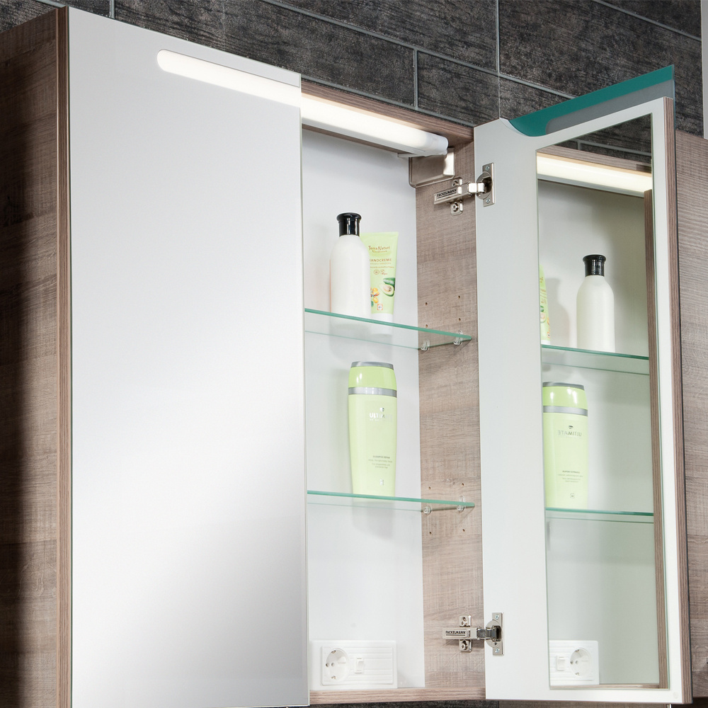 - Szafka lustrzana z oświetleniem LED z serii A-Vero, o szerokości 70 cm oraz korpusem w kolorze szary dąb.