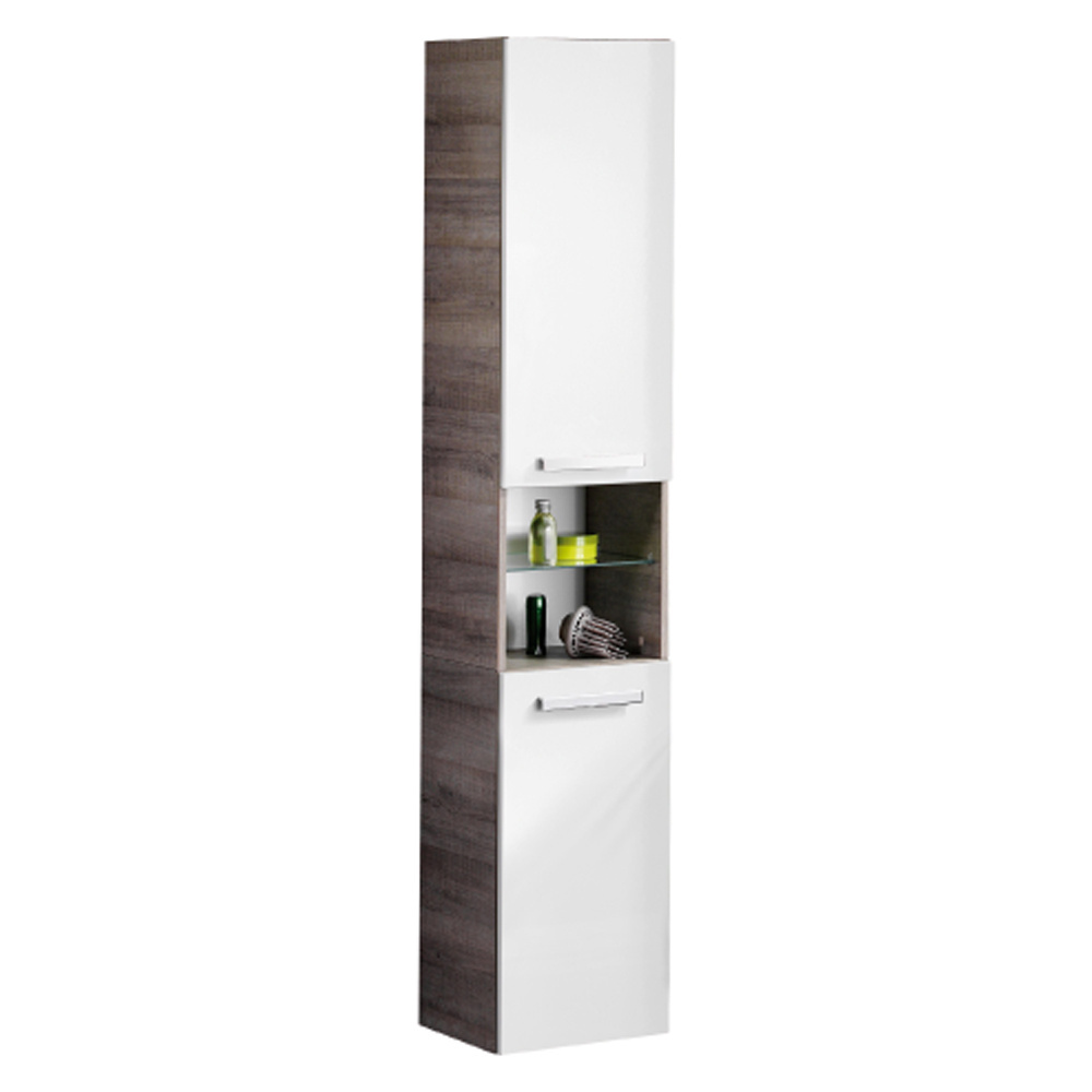 - Szafka łazienkowa boczna, wysoka, wisząca o szerokości 35 cm. Korpus w kolorze szary dąb, front w kolorze biały wysoki połysk.
