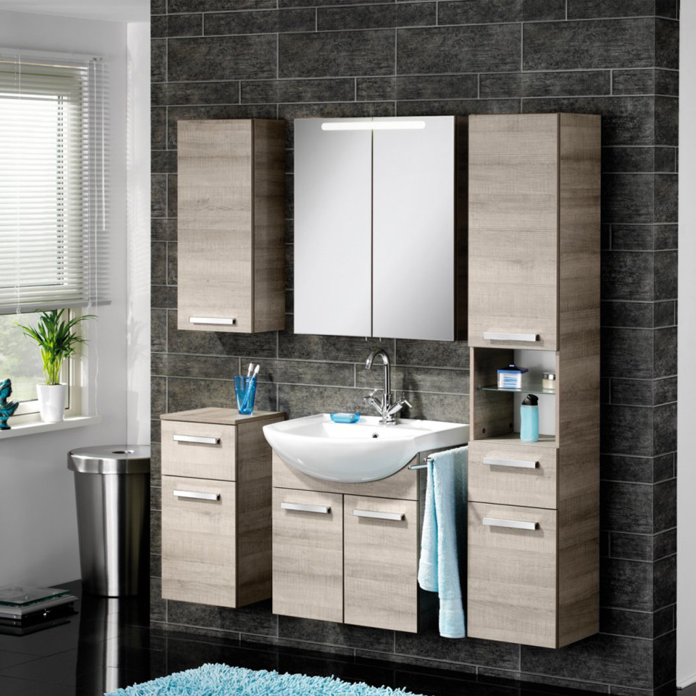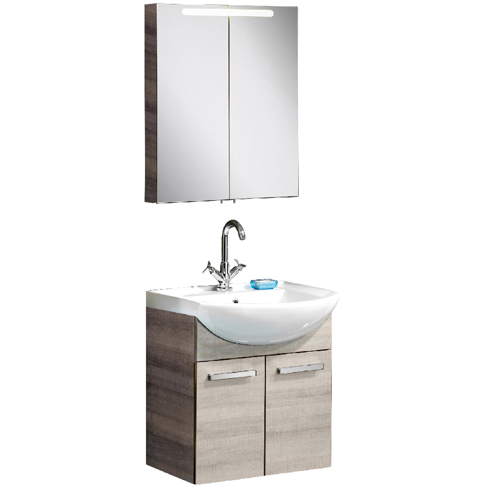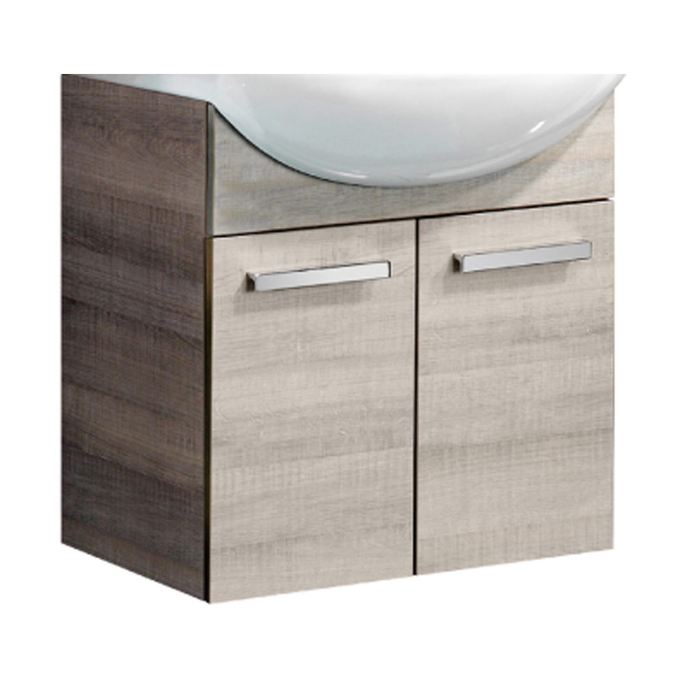 - Zestaw mebli łazienkowych z serii A-Vero, w skład którego wchodzą: szafka lustrzana, szafka pod umywalkę o szerokości 62,4 cm oraz umywalka ceramiczna.