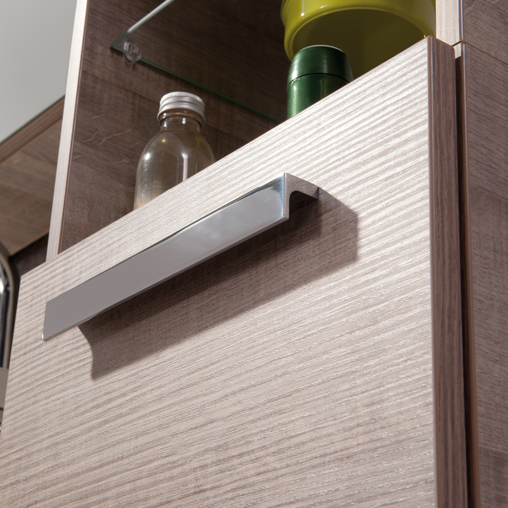 W tej kolekcji, oprócz klasycznych frontów w kolorze białego połysku, połączonych z korpusami we wzór szarego dębu, znajdziemy również meble w całości wykonane w tym przypominającym drewno dekorze. Całości charakteru dodają szerokie i wyraziste chromowane uchwyty.