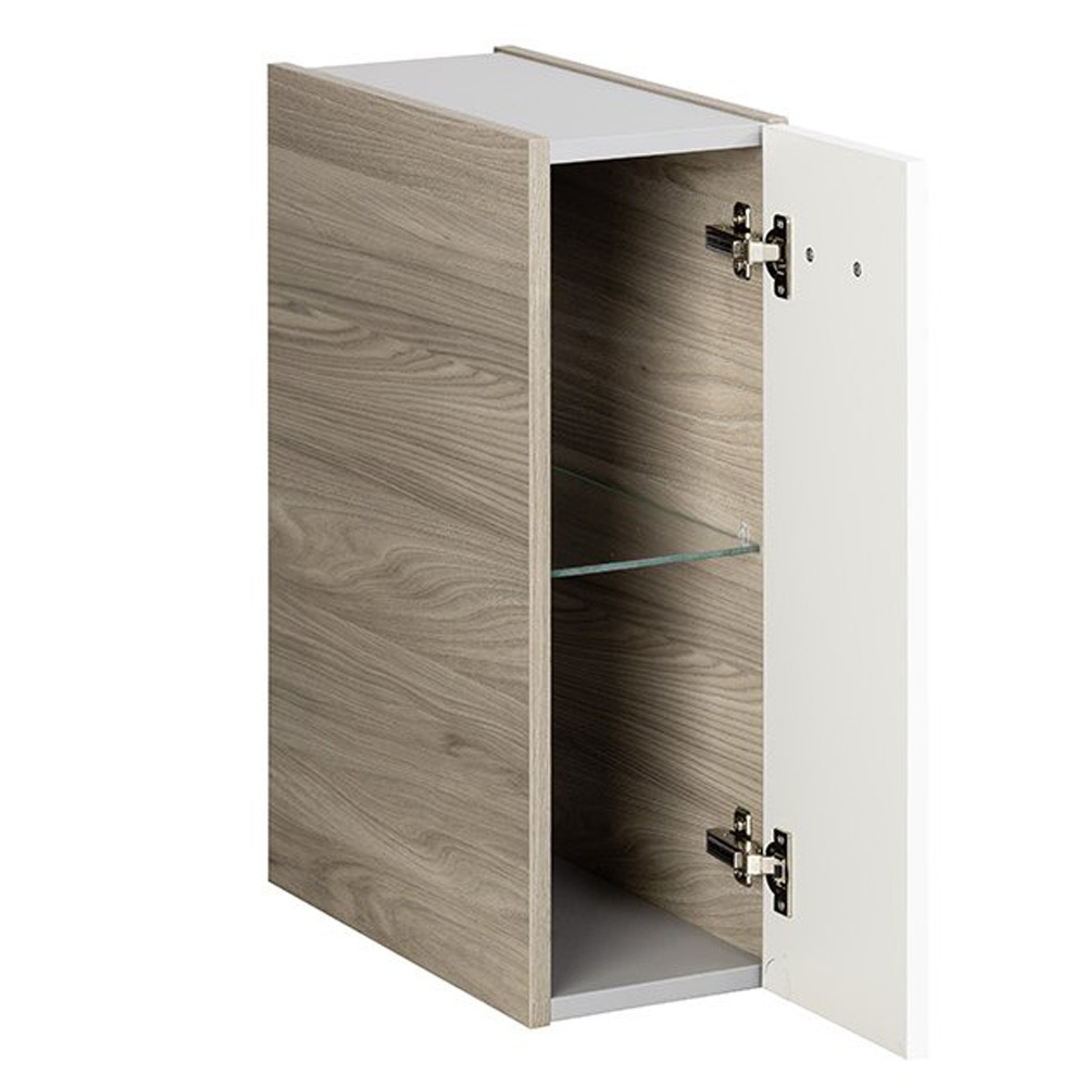 - Szafka łazienkowa, boczna, prawa, o szerokości 20 cm, dzięki której możliwa jest rozbudowa szafki pod umywalkę (79803) do 100 lub 120 cm. Korpus w kolorze szary dąb, front w kolorze biały wysoki połysk.