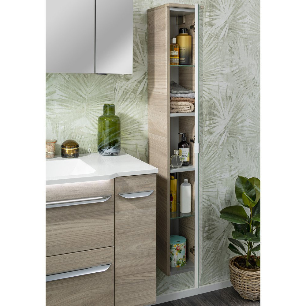 Podwójna średnia szafka boczna o szerokości 60,2 cm, a także wysoki słupek boczny mierzący 139,6 cm wysokości, stanowią dodatkowe, praktyczne miejsce do przechowywania. Ponadto, boczny słupek został zaprojektowany tak, aby w jego lustrzanym froncie, można było zobaczyć odbicie całej sylwetki