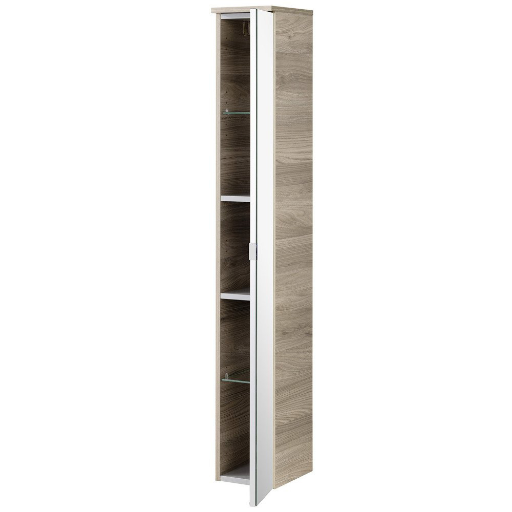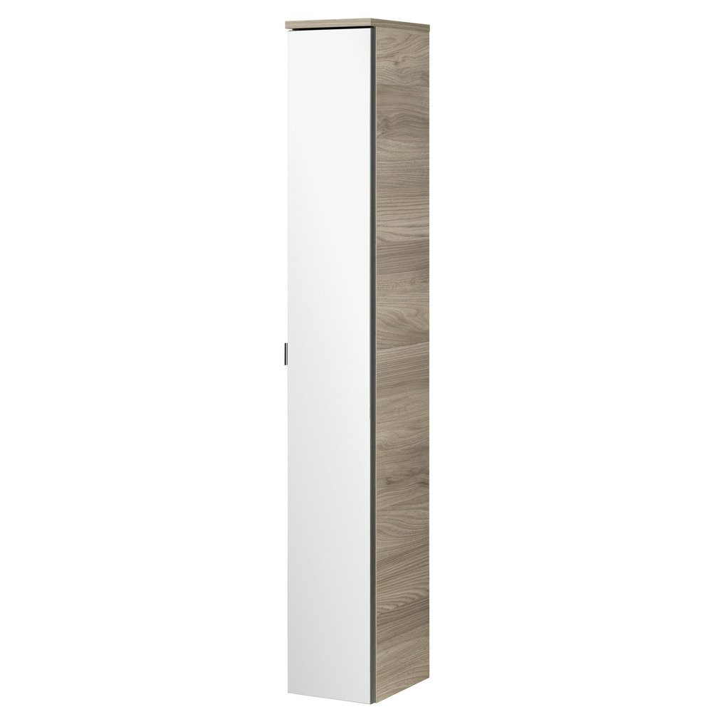 - Szafka łazienkowa, boczna, prawa, o szerokości 20,2 cm. Korpus w kolorze szary dąb, lustrzany front.