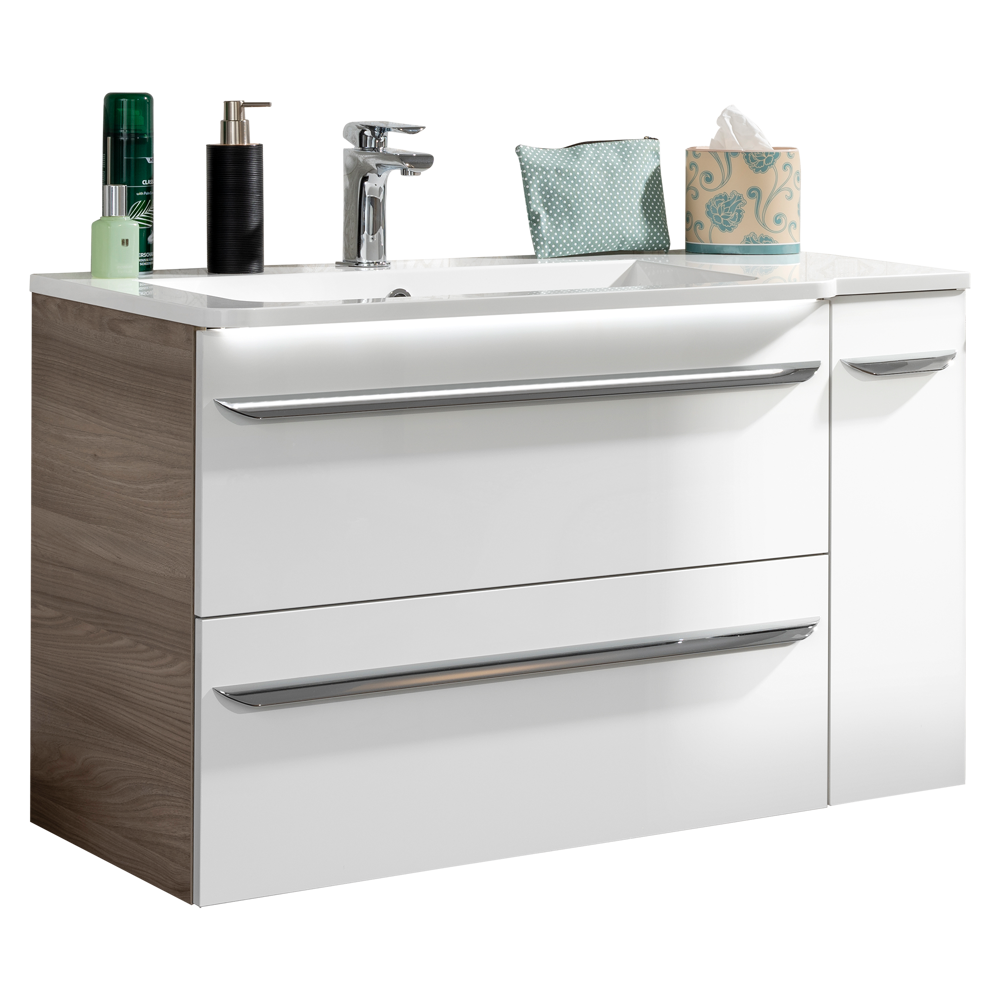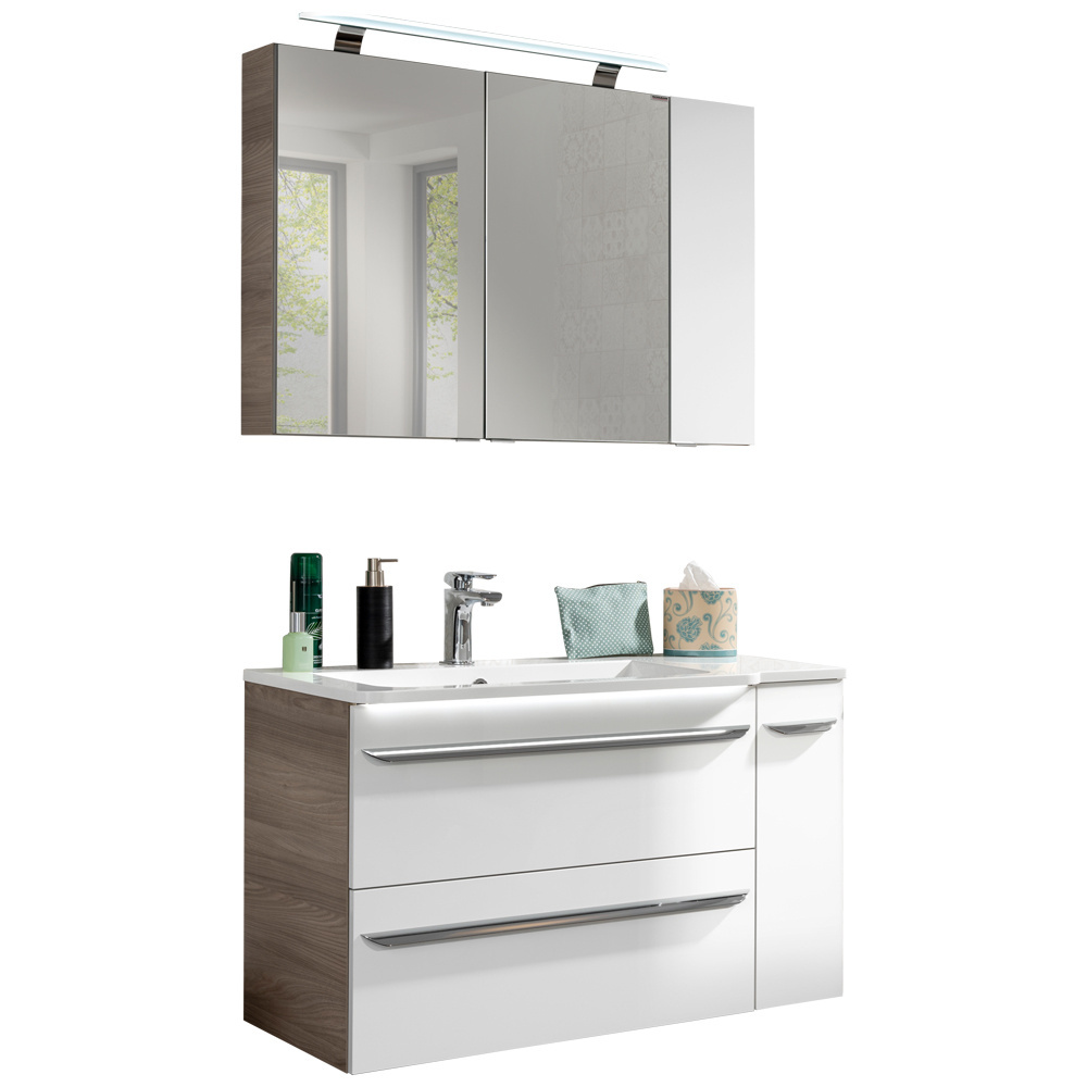- Zestaw mebli łazienkowych z serii Luxor, w skład którego wchodzą: szafka lustrzana z szafką boczną, szafka pod umywalkę z szafką boczną oraz umywalka z konglomeratu.