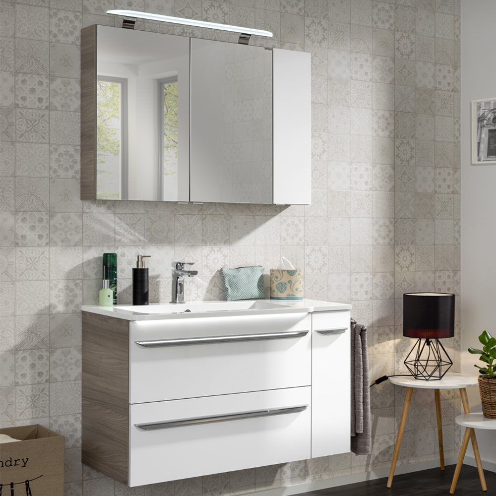 Świetnym rozwiązaniem może okazać się rozbudowa lustrzanej szafki z oświetleniem LED o szerokości 80 cm - dzięki dopasowaniu do niej szafek bocznych o szerokości 20 cm z lustrzanymi frontami, zyskać można dużo większą powierzchnię lustra, jednak nie jest to jedyna możliwość - górne szafki boczne dostępne są również w wersjach z frontami w kolorze mebli.