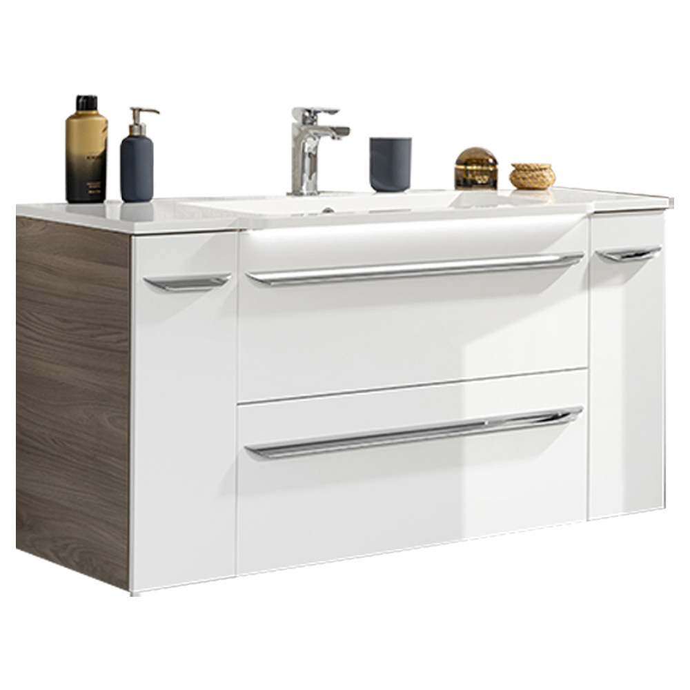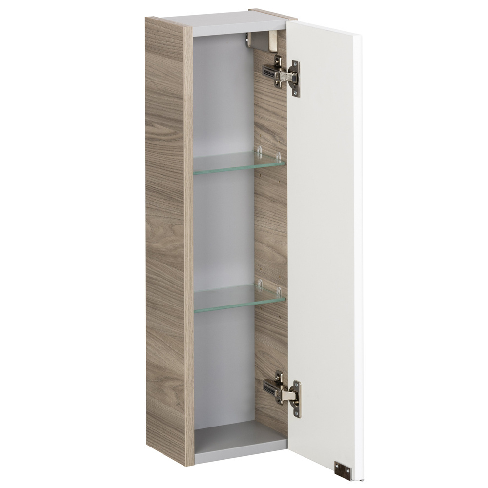 Podwójna średnia szafka boczna o szerokości 60,2 cm, a także wysoki słupek boczny mierzący 139,6 cm wysokości, stanowią dodatkowe, praktyczne miejsce do przechowywania. Ponadto, boczny słupek został zaprojektowany tak, aby w jego lustrzanym froncie, można było zobaczyć odbicie całej sylwetki