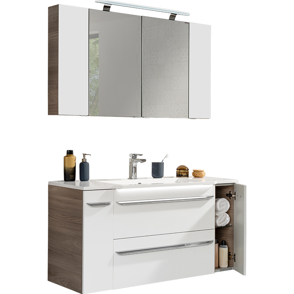 - Zestaw mebli łazienkowych z serii Luxor, w skład którego wchodzą: szafka lustrzana z szafkami bocznymi, szafka pod umywalkę z szafkami bocznymi oraz umywalka z konglomeratu.