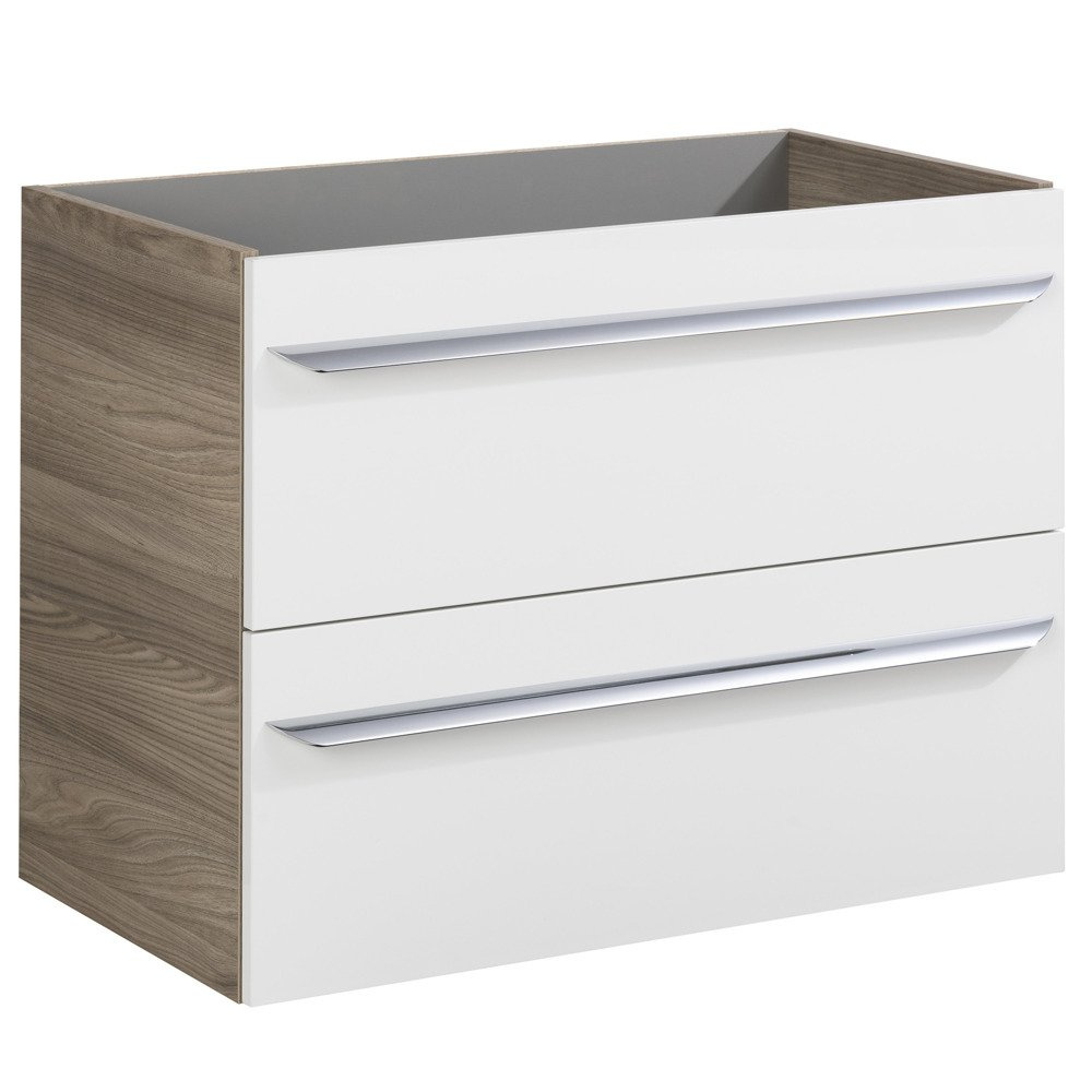 Korpus w kolorze szary dąb, front w kolorze biały wysoki połysk, dwie pojemne szuflady - w górnej znajduje się organizer do przechowywania.