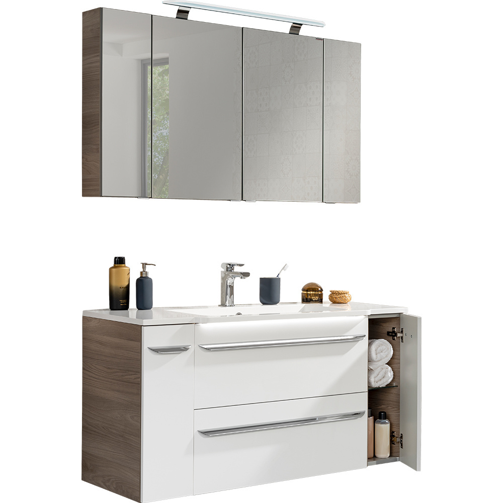 - Zestaw mebli łazienkowych z serii Luxor, w skład którego wchodzą: szafka lustrzana z lustrzanymi szafkami bocznymi, szafka pod umywalkę z szafkami bocznymi oraz umywalka z konglomeratu.