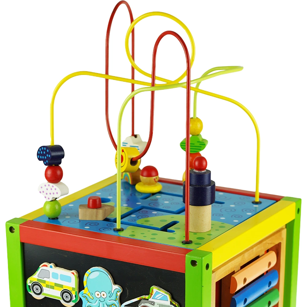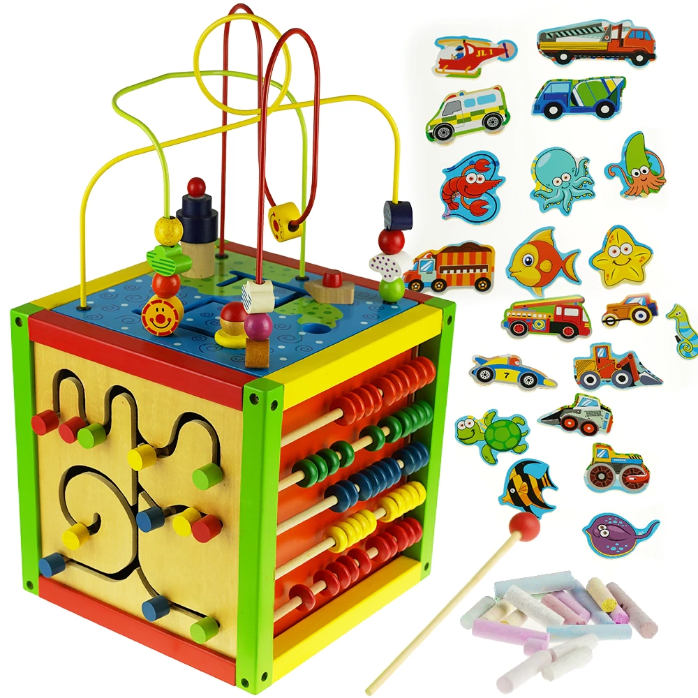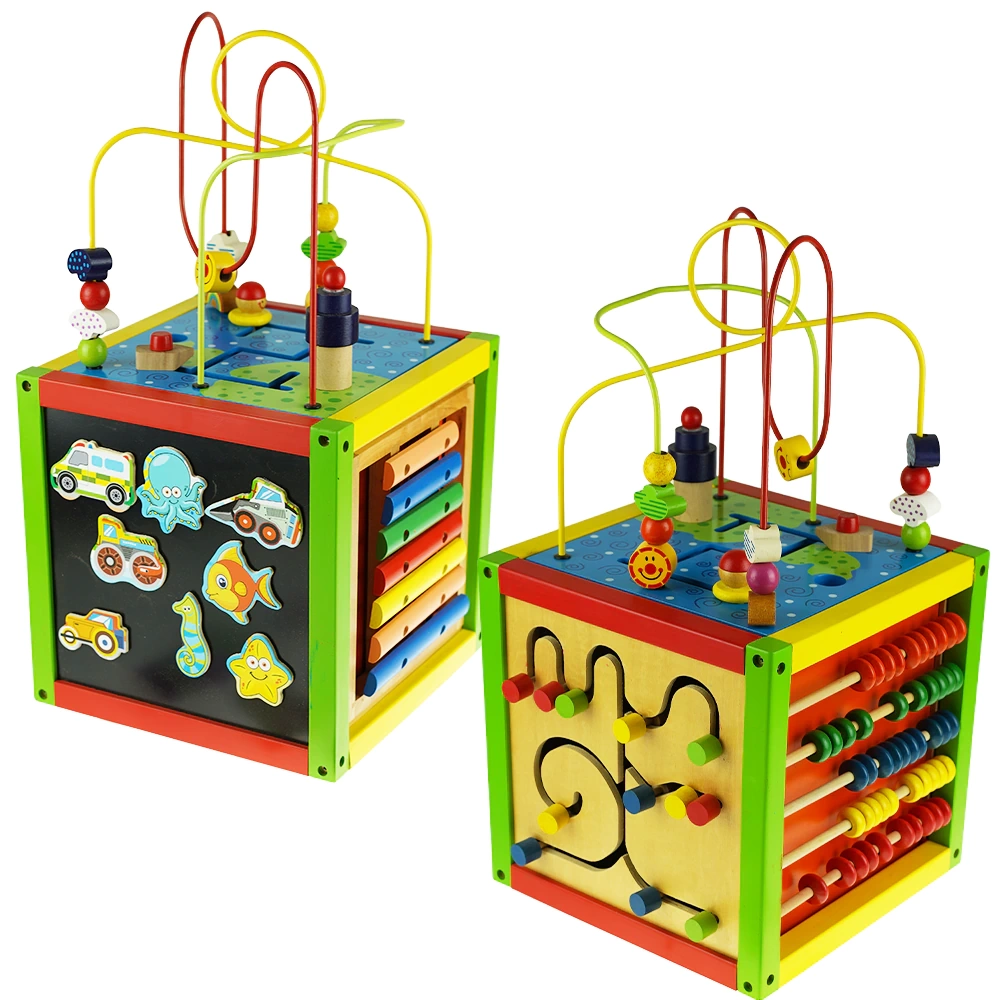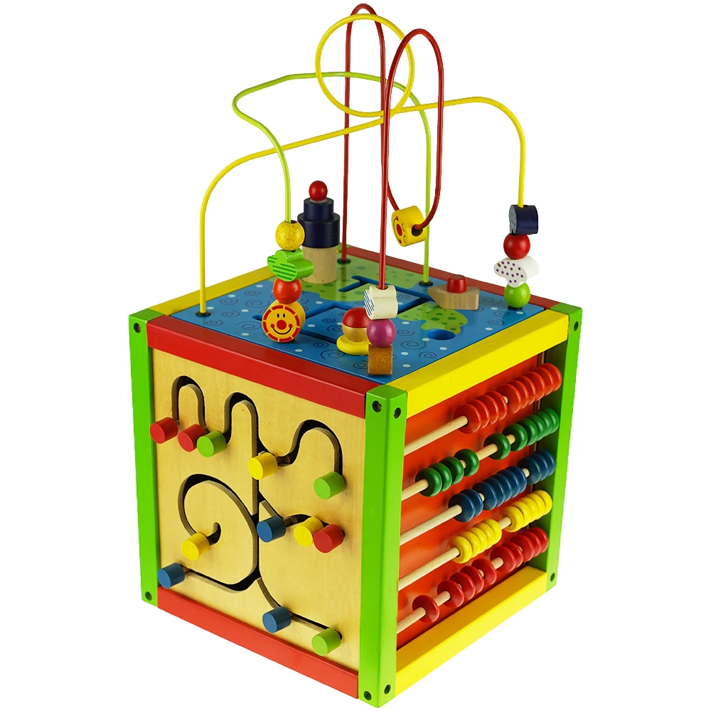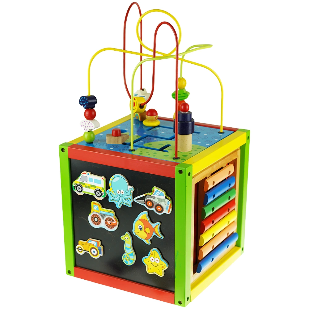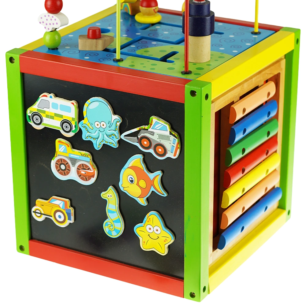 - Wielofunkcyjna drewniana kostka aktywności, to świetna zabawka edukacyjna dla najmłodszych, stymulująca motorykę oraz wyobraźnię.