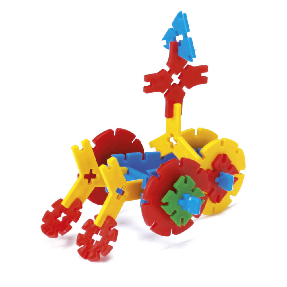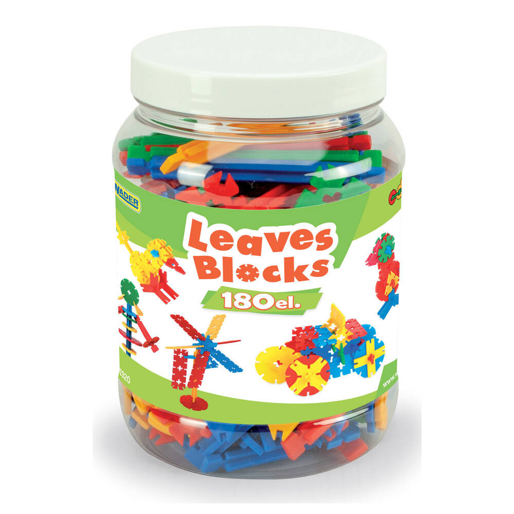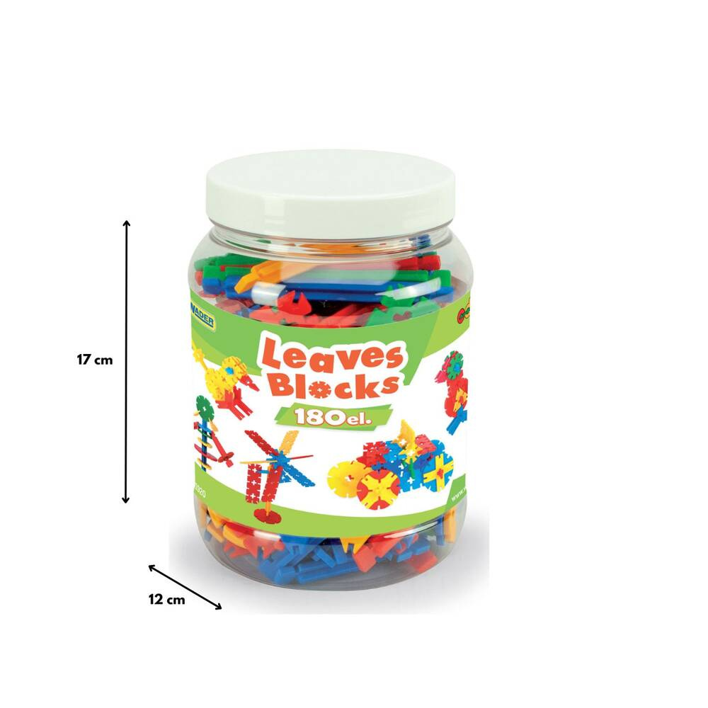 Zestaw zawiera 180 elementów, a bardzo oryginalne, nietypowe kształty i łatwość łączenia klocków stwarzają niewyczerpalne pole do popisu dla dziecięcej fantazji. Możliwości są nieograniczone – wspólnie można zbudować samochody, statki kosmiczne, figurki zwierząt i roślin, budynki, domy z ogródkiem i wiele innych konstrukcji. System montażu ułatwia wzajemne łączenie elementów, co pozwala tworzyć większe budowle przestrzenne. Zestaw zapakowany jest w praktyczny słoik, który ułatwi przechowywanie klocków.
