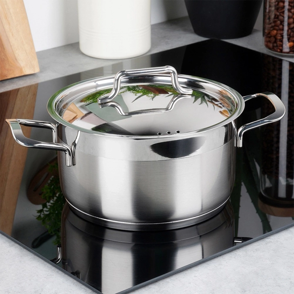 - STALOWY - Najwyższej jakości stal szlachetna 18/10 - matowa z dodatkowym pasem połysku w górnej zewnętrznej części naczynia. Grube i solidne ścianki boczne naczynia. Garnek jest ciężki i masywny.