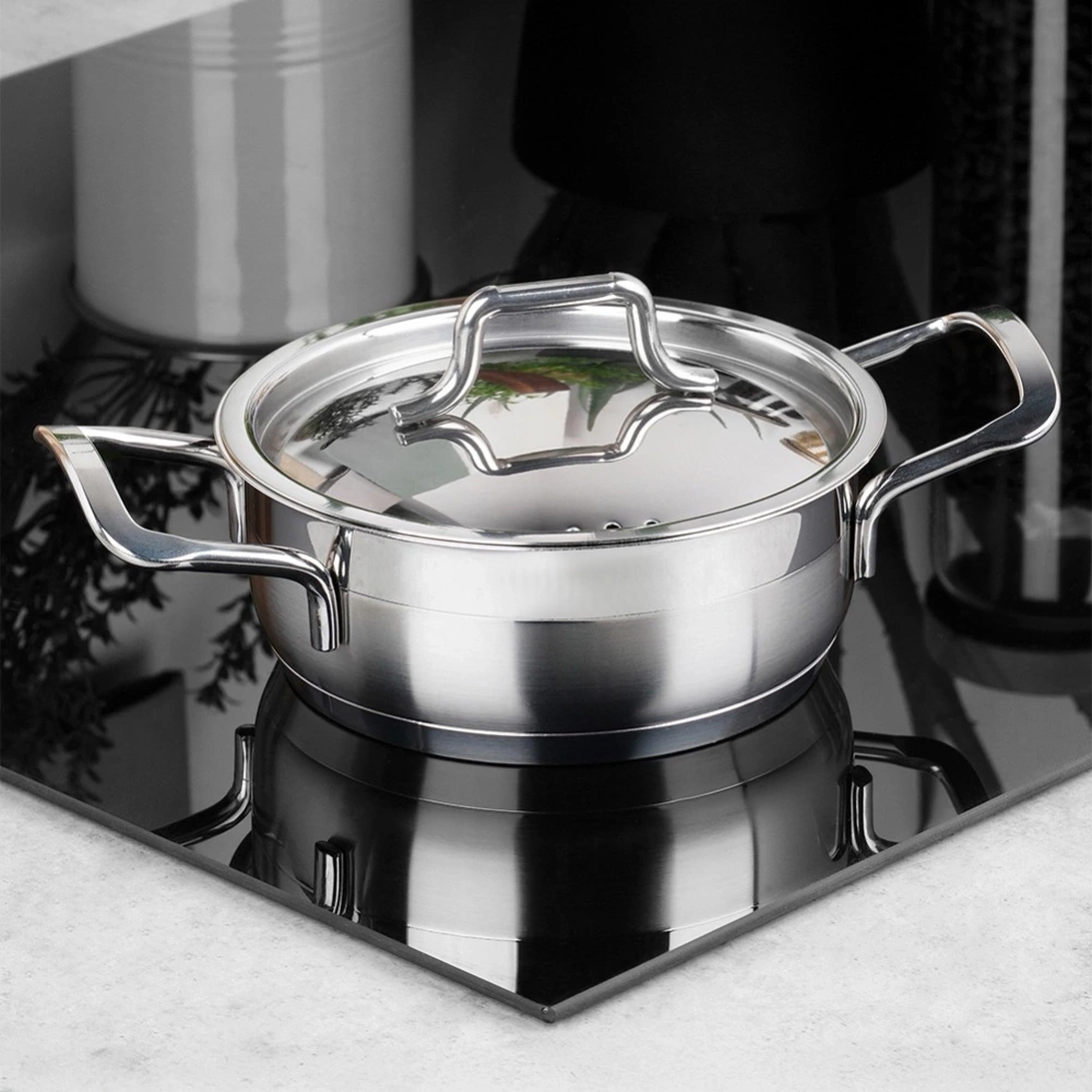 - STALOWY - Najwyższej jakości stal szlachetna 18/10 - matowa z dodatkowym pasem połysku w górnej zewnętrznej części naczynia. Grube i solidne ścianki boczne naczynia. Garnek jest ciężki i masywny.