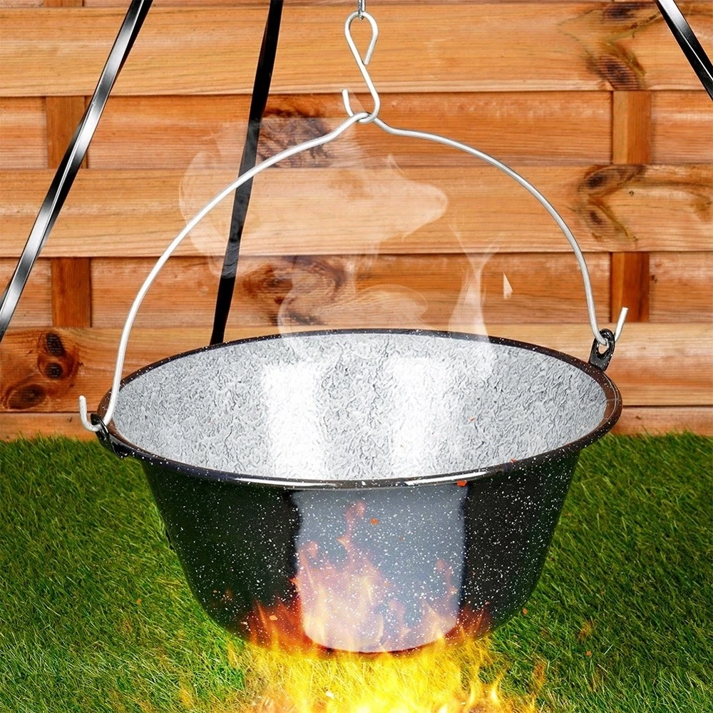 - PRAKTYCZNY - Kociołek węgierski, emaliowany z uchwytem do podwieszenia. Kociołek o średnicy 40 cm i pojemności 13 litrów. Wymiary zewnętrzne kociołka z uchwytem: 46 x 40 x 17,5 cm, a długość uchwytu wynosi 18 cm. Idealne sprawdzi się do przygotowywania dań w ogrodzie, na kempingu, przy grillu czy też ognisku.