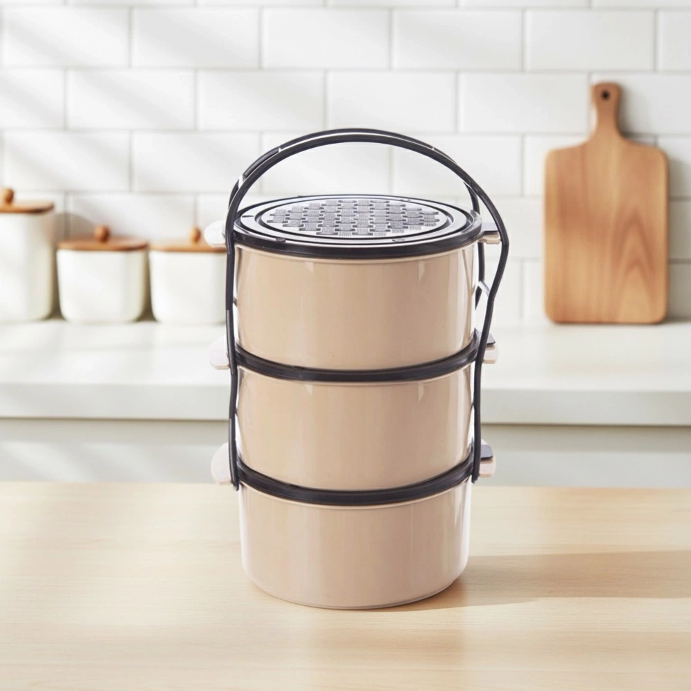 - Menażka do przenoszenia żywności. W zestawie 3 pojemniki z pokrywkami oraz stelaż z uchwytem. Wykonana z najwyższej jakości tworzywa. Każdy pojemnik ma pojemność 1,5 l.