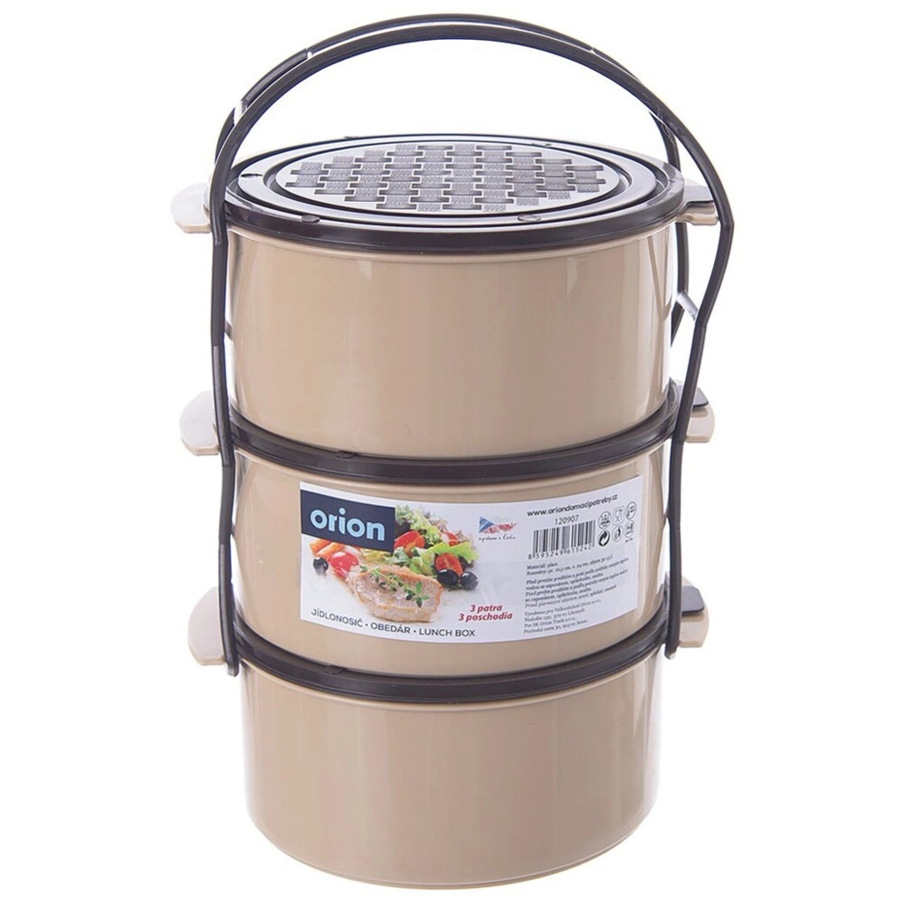 Menażka obiadowa do transportowania żywności. Wykonana z materiałów bezpiecznych dla zdrowia i neutralnych dla żywności. Posiada trzy pojemniki, które pozwolą odpowiednio przenieść posiłek. Pojemniki połączone są klamrą, dzięki czemu możemy wygodnie je piętrować. Doskonale sprawdzi się podczas wędrówek, biwaków, górskich wypraw oraz innych wypadów. Latem możemy wykorzystać ją do przechowywania i przenoszenia lodów np. podczas przyjęć w ogrodzie. Oryginalny produkt czeskiej marki Orion. Wyprodukowano zgodnie z europejskimi standardami.