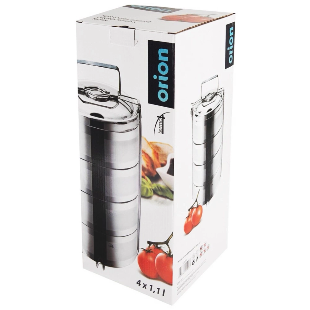 Menażka obiadowa termiczna do transportowania żywności. Wykonana z materiałów bezpiecznych dla zdrowia i neutralnych dla żywności. Posiada cztery pojemniki, które pozwolą odpowiednio przenieść posiłek. Pojemniki połączone są klamrą, dzięki czemu możemy wygodnie je piętrować. Doskonale sprawdzi się podczas wędrówek, biwaków, górskich wypraw oraz innych wypadów. Latem możemy wykorzystać ją do przechowywania i przenoszenia lodów np. podczas przyjęć w ogrodzie. Oryginalny produkt czeskiej marki Orion. Wyprodukowano zgodnie z europejskimi standardami.